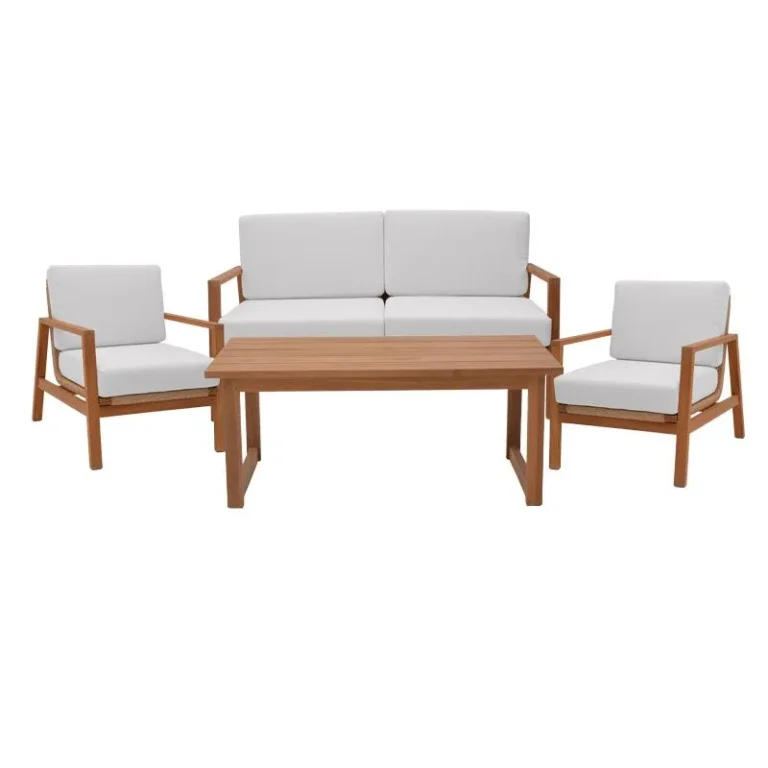Σαλόνι Doumain σετ 4 τεμαχίων φυσικό teak ξύλο-λευκό μαξιλάρι-φυσικό ραττάν