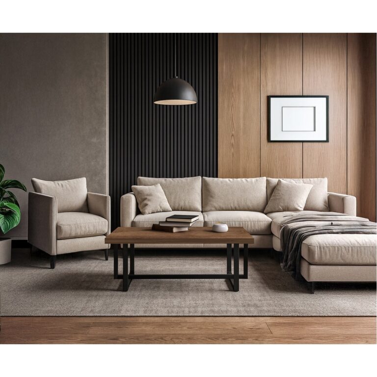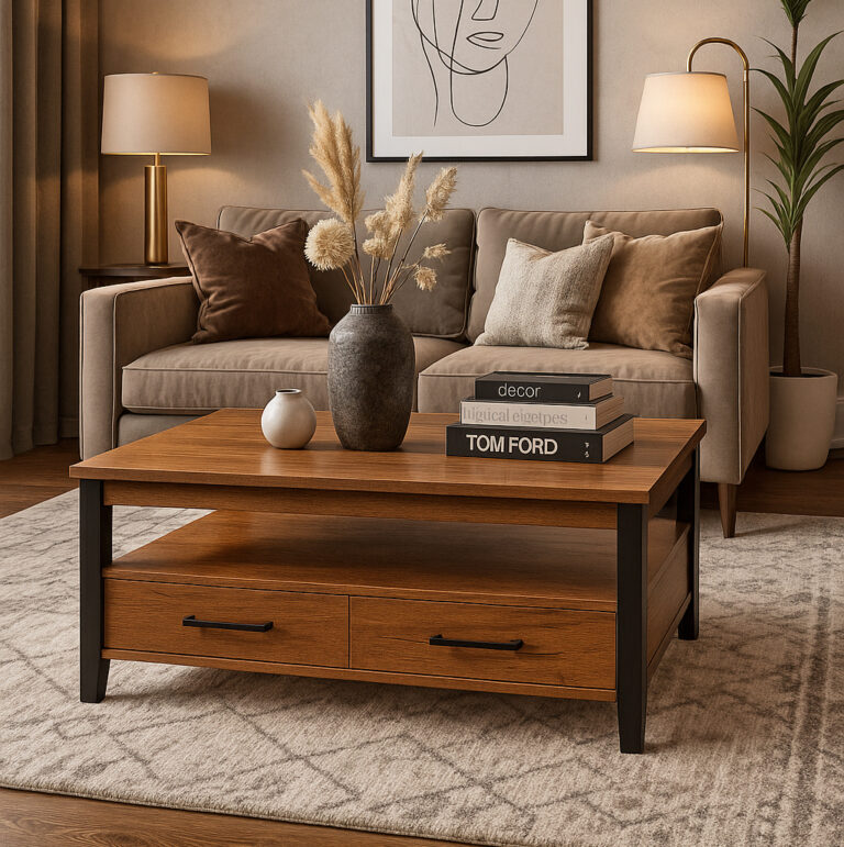 Τραπέζι σαλονιού Ezerdian μασίφ ξύλο ακακίας σε φυσική απόχρωση με επιφάνεια μαρμάρου