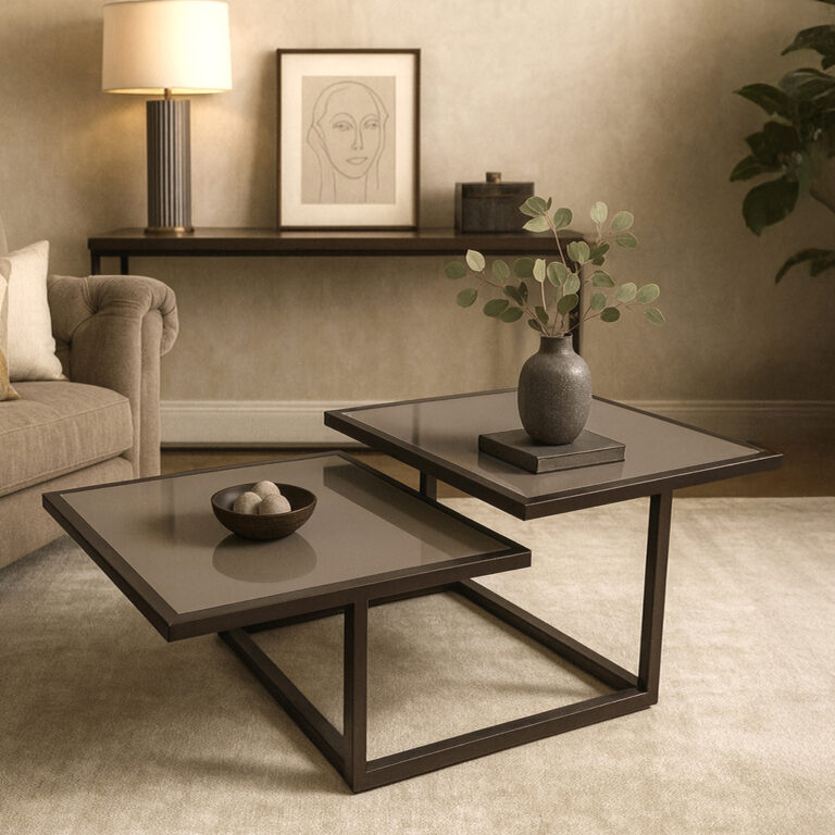 ΤΡΑΠΕΖΙ ΣΑΛΟΝΙΟΥ ERNEST ΣΕ ΣΚΟΥΡΟ ΚΑΦΕ ΧΡΩΜΑ ΞΥΛΟΥ ΚΑΙ ΜΑΥΡΗ ΜΕΤΑΛΛΙΚΗ ΒΑΣΗ