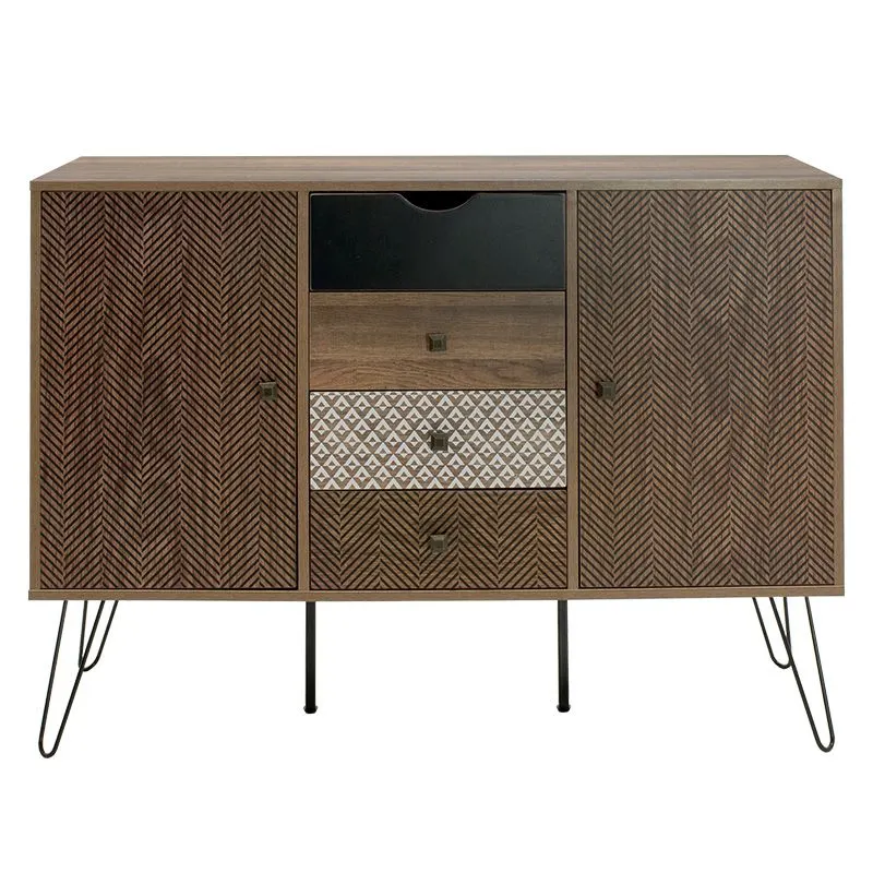 Ανανεώστε τον χώρο σας με τον μπούφε Boho, που συνδυάζει κομψότητα, minimal design και πρακτικότητα. Με μοντέρνο σχεδιασμό, καρυδί χρώμα με γεωμετρικά μοτίβα και μαύρα μεταλλικά πόδια, παρέχει τέσσερα συρτάρια και δύο ντουλάπια για εργονομική αποθήκευση και αισθητική αναβάθμιση του χώρου σας.