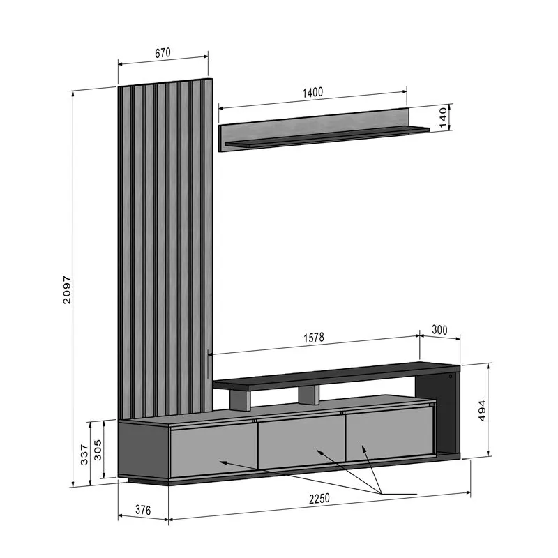 Περιλαμβάνει ράφι για ηλεκτρονικές συσκευές και τρία ντουλάπια για μικροαντικείμενα.