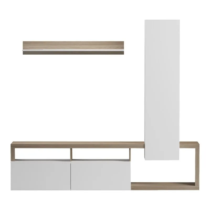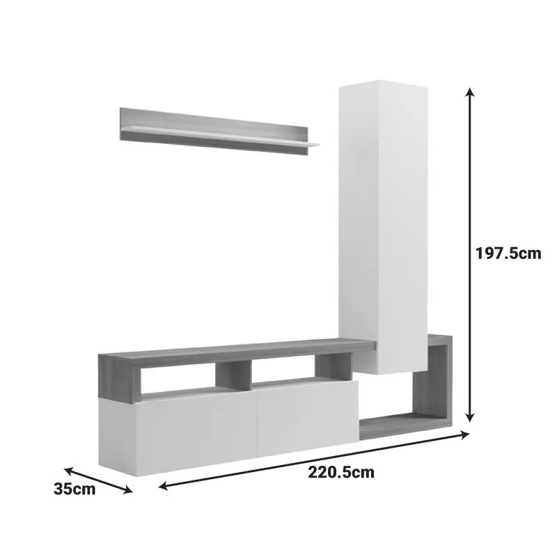 Μεταμορφώστε το σαλόνι σας με το κομψό και λειτουργικό μοντέρνο σύνθετο σαλονιού Leganto, που συνδυάζει αρμονικά τον ζεστό χρωματικό τόνο sonoma με καθαρές λευκές λεπτομέρειες. Το minimal design του δημιουργεί μία ατμόσφαιρα ηρεμίας και κομψότητας, ενώ η έξυπνη κατασκευή του προσφέρει πληθώρα αποθηκευτικών χώρων και εκθεσιακών επιφανειών για ηλεκτρονικές συσκευές, βιβλία και διακοσμητικά αντικείμενα.