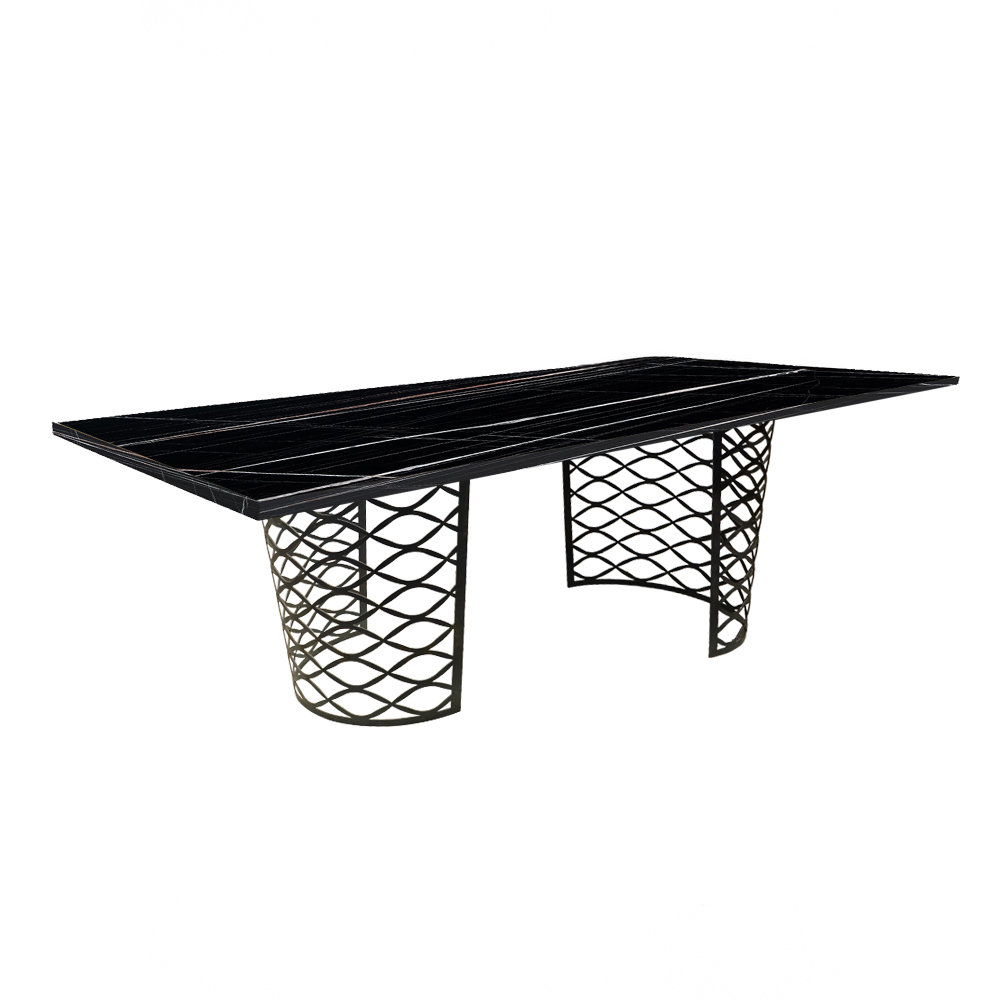 Ανακαλύψτε ένα τραπέζι που μετατρέπει την τραπεζαρία σας σε χώρο υψηλής αισθητικής. Η επιβλητική επιφάνεια, σε όψη μαύρου μάρμαρου, ακουμπά επάνω σε μία από τις πιο ιδιαίτερες και αρχιτεκτονικά εντυπωσιακές βάσεις της αγοράς.