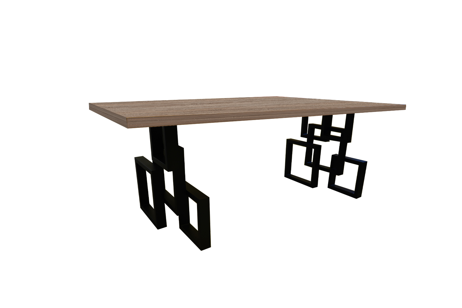 Αποτελείται από δύο ανεξάρτητες μεταλλικές δομές, τοποθετημένες συμμετρικά στις άκρες του τραπεζιού. Κάθε δομή αποτελείται από επάλληλα τετράγωνα και ορθογώνια πλαίσια που ενώνονται μεταξύ τους, δημιουργώντας ένα σύμπλεγμα σε τρισδιάστατη μορφή. Αυτός ο σχεδιασμός όχι μόνο προσφέρει οπτική ισορροπία, αλλά εξασφαλίζει και σταθερότητα και αντοχή στη χρήση.