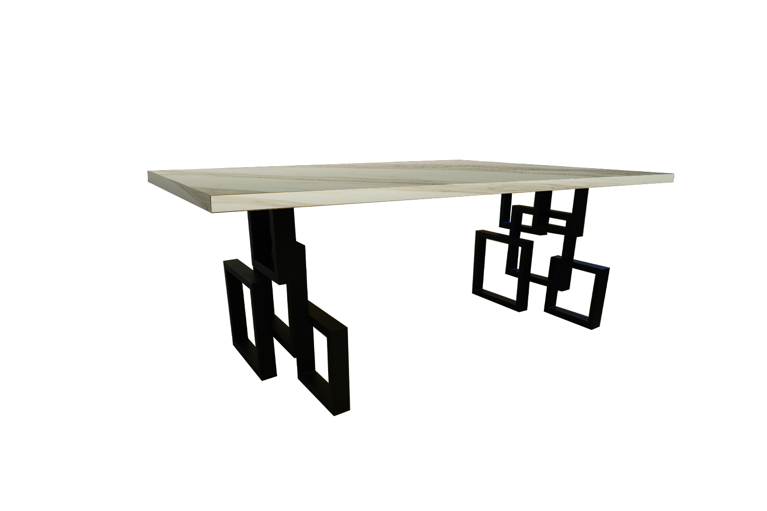 Αποτελείται από δύο ανεξάρτητες μεταλλικές δομές, τοποθετημένες συμμετρικά στις άκρες του τραπεζιού. Κάθε δομή αποτελείται από επάλληλα τετράγωνα και ορθογώνια πλαίσια που ενώνονται μεταξύ τους, δημιουργώντας ένα σύμπλεγμα σε τρισδιάστατη μορφή. Αυτός ο σχεδιασμός όχι μόνο προσφέρει οπτική ισορροπία, αλλά εξασφαλίζει και σταθερότητα και αντοχή στη χρήση.