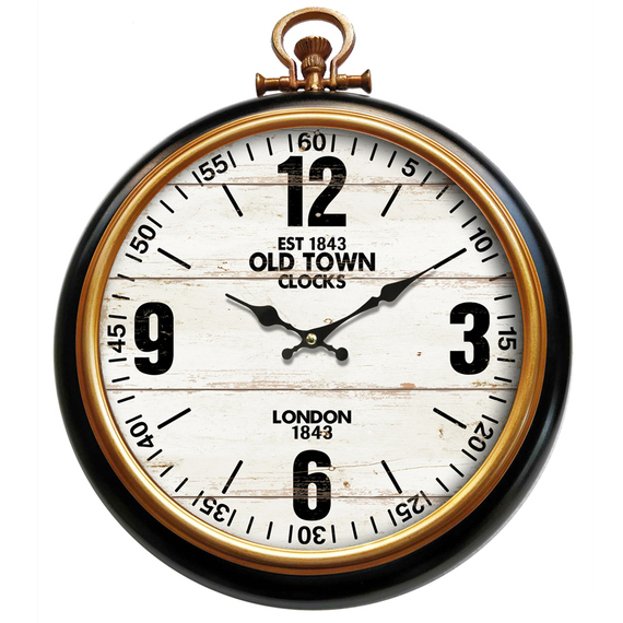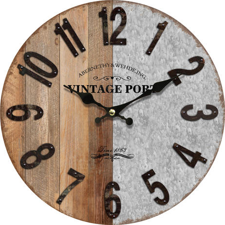 Ρολόι τοίχου στρογγυλό από μέταλλο και ξύλο με πρωτότυπο πάτερν για φόντο και μαύρους δείκτες.