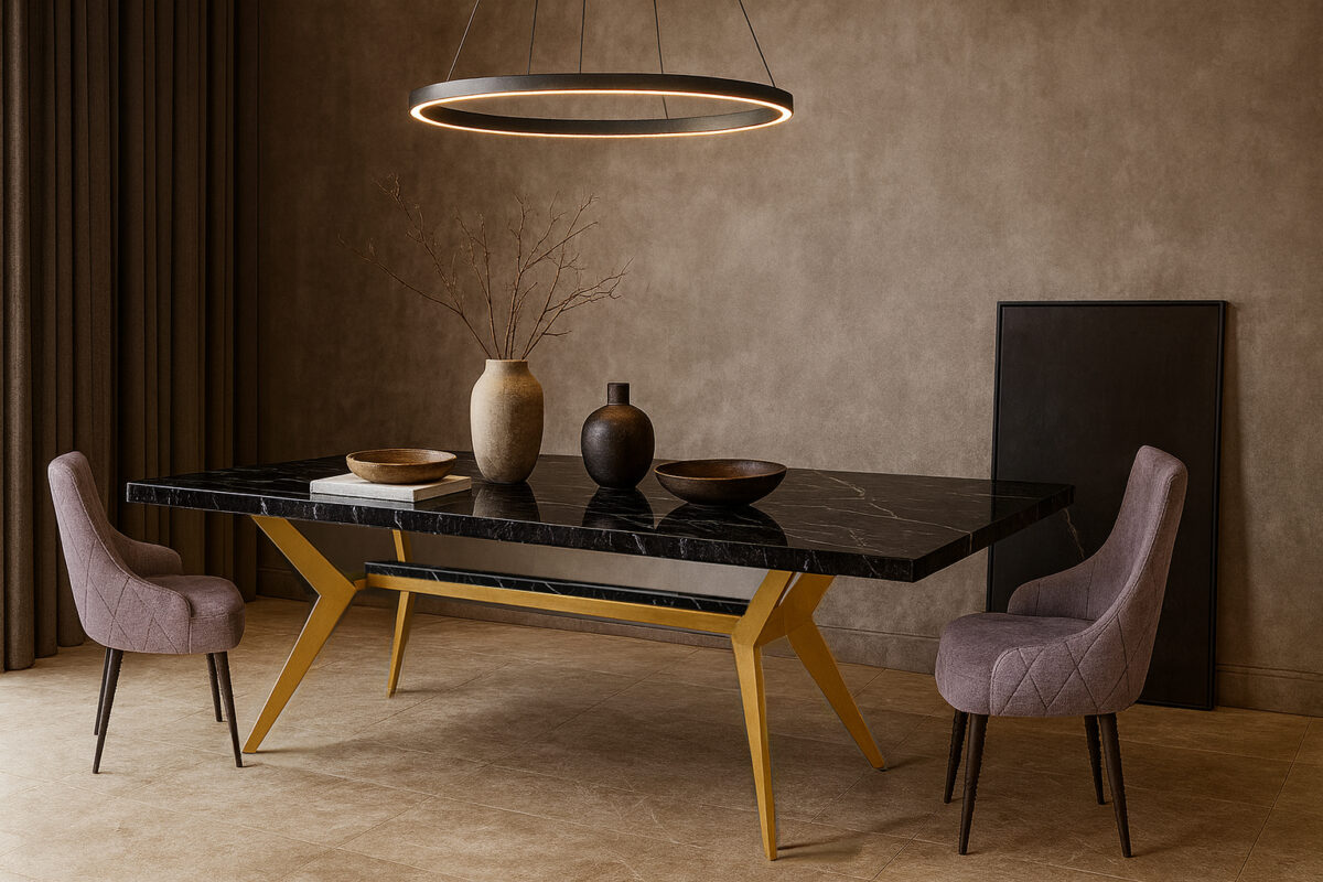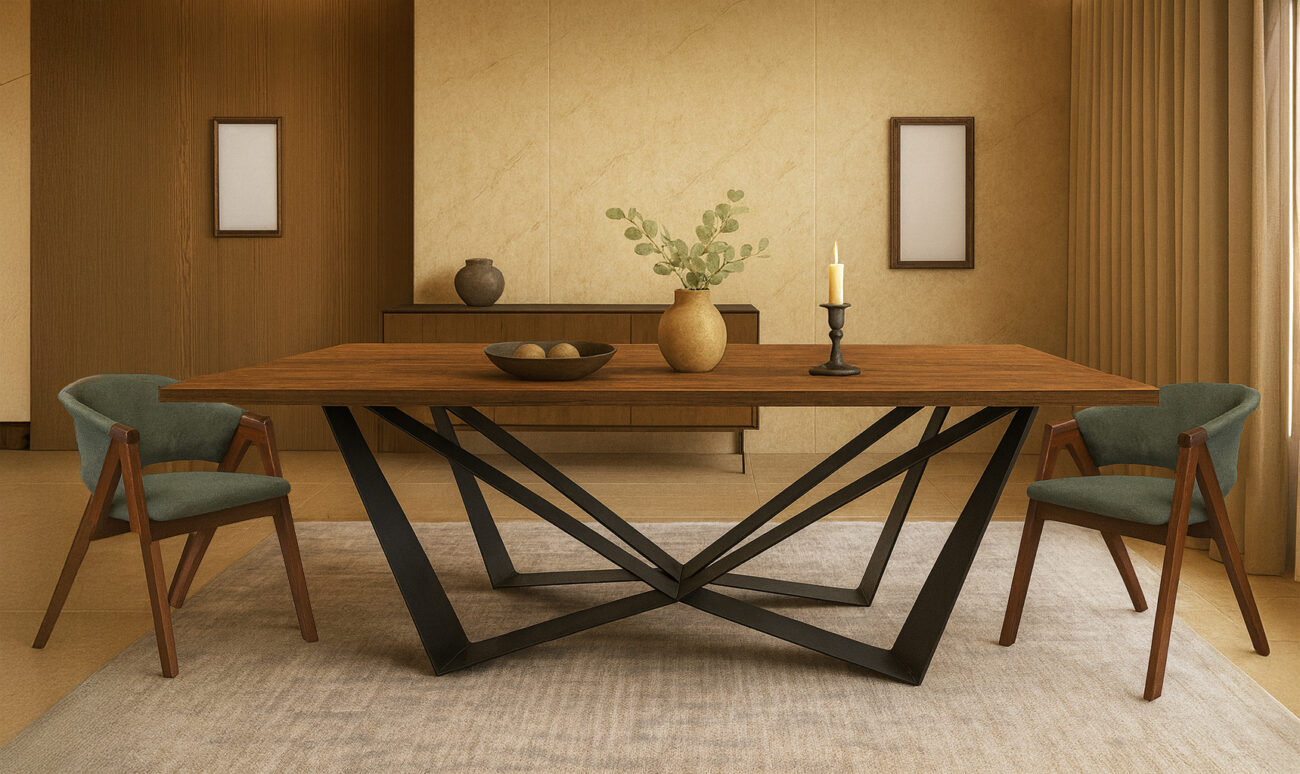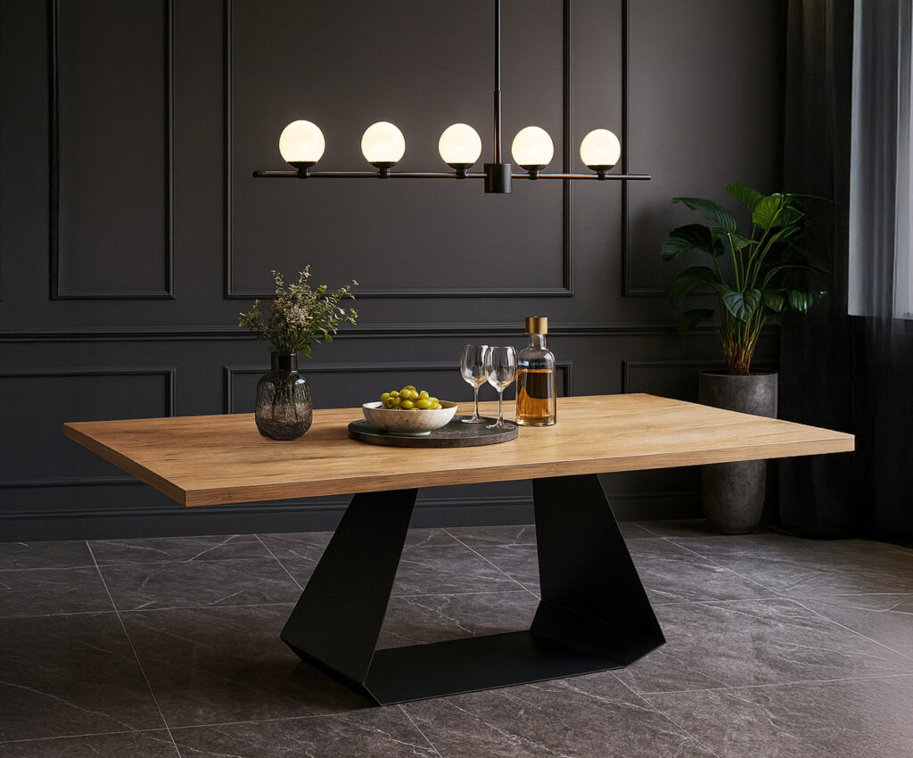 Σετ Τραπεζαρίας Μοντέρνου Σχεδιασμού – Ξύλινο Τραπέζι με Μεταλλική Βάση & Υφασμάτινες Καρέκλες