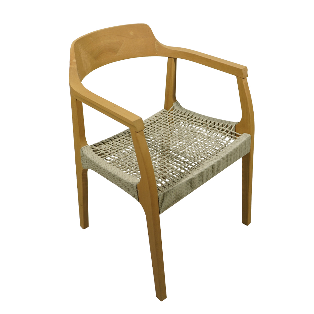 Μια μοντέρνα και κομψή ξύλινη καρέκλα που εντυπωσιάζει με την εργονομία και το φυσικό της ύφος. Διαθέτει καμπυλωτή πλάτη για άνετη υποστήριξη της μέσης και διακριτικά ενσωματωμένα μπράτσα, προσφέροντας ιδανική στήριξη για καθημερινή χρήση. Το χειροποίητο κάθισμα από κορδόνι σε μπέζ απόχρωση συνδυάζει υψηλή αισθητική με εξαιρετική αντοχή.