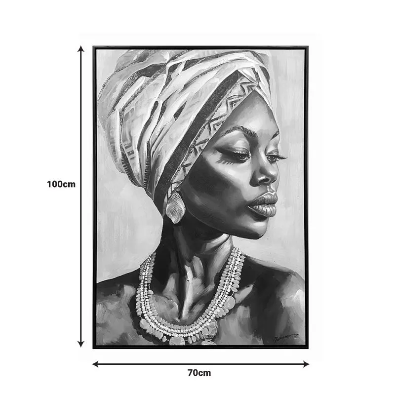 Ο πίνακας “Zaira”, διαστάσεων 70×3.5×100 εκ., με καμβά και πλαίσιο. Η απεικόνιση δείχνει μια κομψή γυναίκα αφρικανικής καταγωγής, με έντονα χαρακτηριστικά, φορώντας τουρμπάνι και εντυπωσιακά κοσμήματα σε τόνους τυρκουάζ και χρυσού.