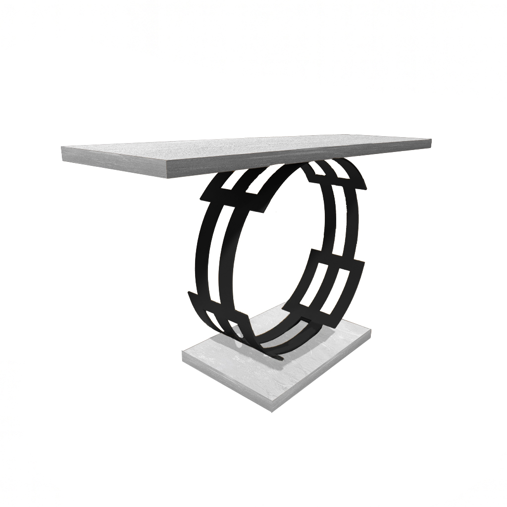 Αναβαθμίστε τον χώρο σας με αυτήν τη μοναδική κονσόλα, που συνδυάζει κομψότητα και σύγχρονο design. Το επάνω μέρος διαθέτει επιφάνεια σε όψη μαρμάρου, προσδίδοντας πολυτέλεια και διαχρονικό χαρακτήρα, ενώ η εντυπωσιακή μεταλλική βάση σε σχήμα δακτυλίου με γεωμετρικές λεπτομέρειες προσφέρει στιβαρότητα και αισθητική αρμονία.