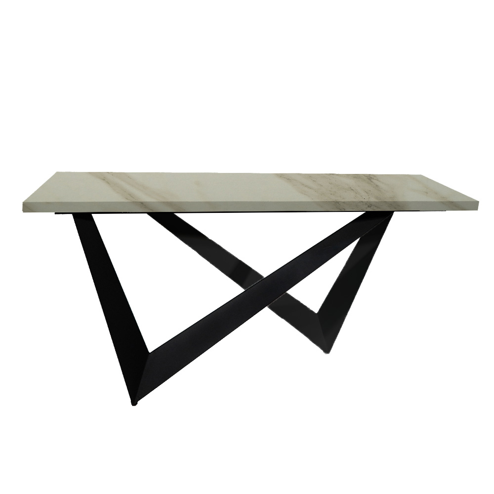 Αναδείξτε την είσοδο ή το σαλόνι σας με αυτή την εκλεπτυσμένη κονσόλα, που εντυπωσιάζει με το μοντέρνο και ταυτόχρονα διαχρονικό της design. Η εντυπωσιακή επιφάνεια τύπου λευκό μάρμαρο με μπέζ φλέβες συνδυάζεται άψογα με μεταλλικά πόδια σε σχήμα “Χ” σε μαύρο , προσφέροντας σταθερότητα και υψηλή αισθητική.