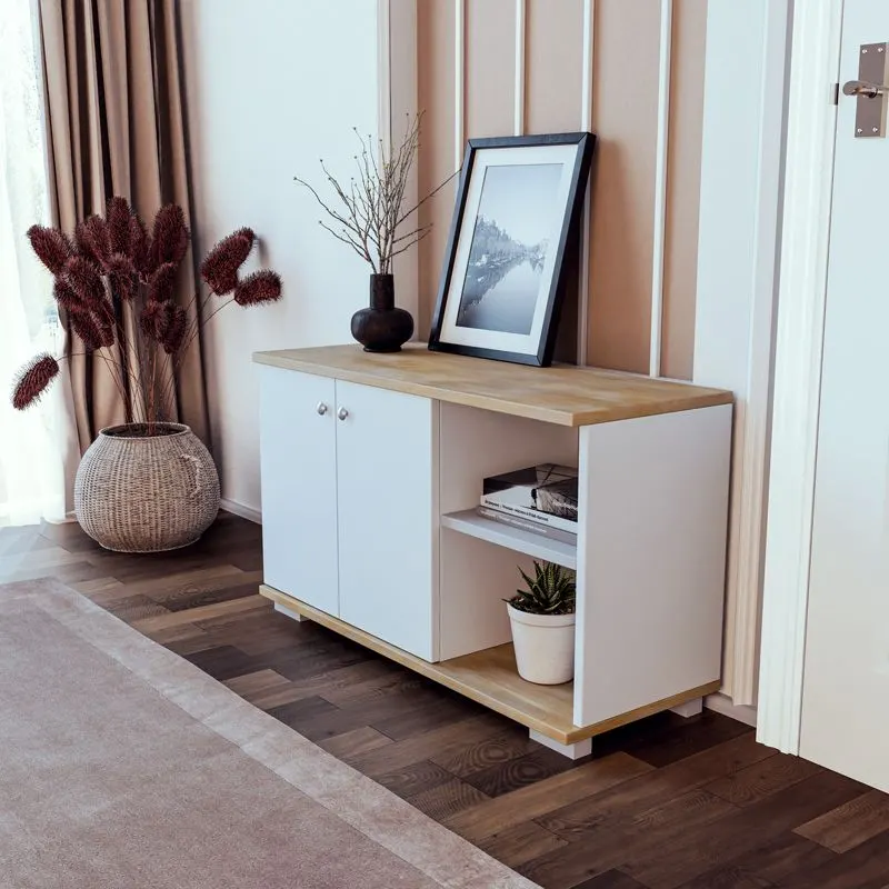 - Το διπλό κλειστό ντουλάπι περιλαμβάνει 4 ράφια και το μονό 5, ενώ το συρόμενο συρτάρι στην κορυφή μπορεί να φανεί πολύ εύχρηστο στο χώρο υποδοχής του σπιτιού.