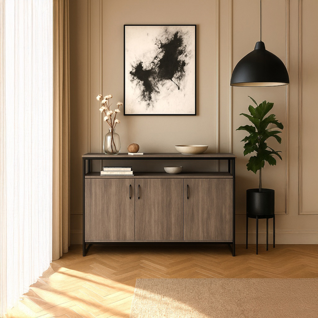 Ολοκληρώστε την διακόσμηση του σαλονιού σας με τον μπουφέ Beleza. Συνδυασμός ξύλου και μετάλλου για μία πιο ιδιαίτερη νότα στο καθιστικό σας.