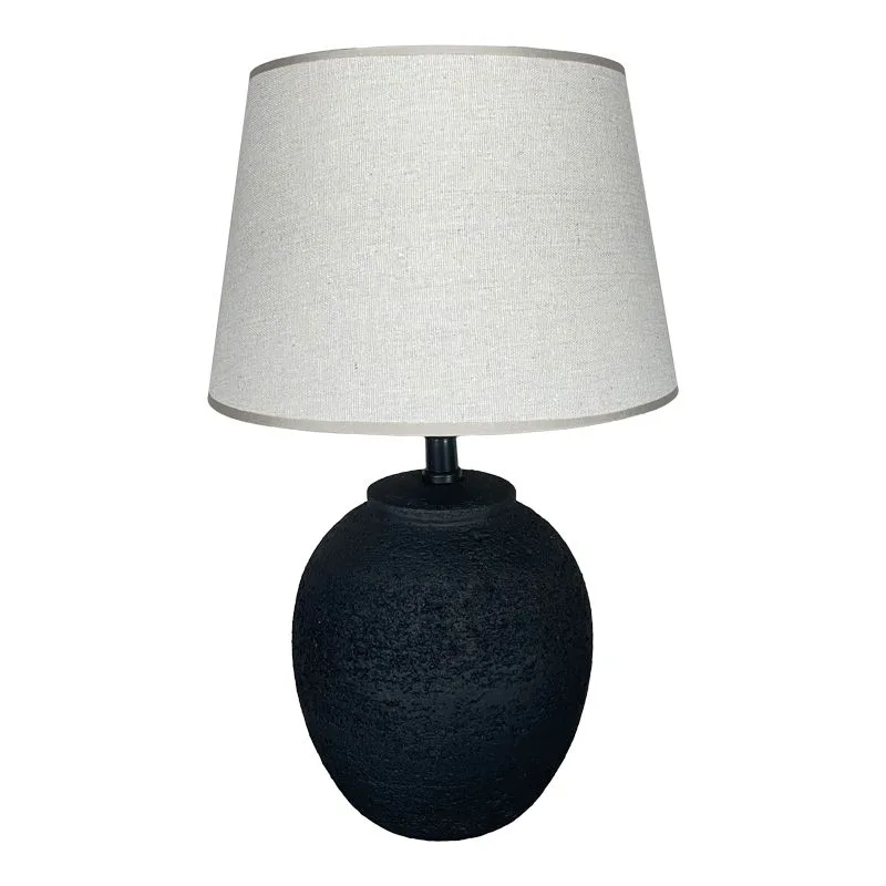 Η στρογγυλεμένη, κεραμική βάση διαθέτει μια διακριτική υφή, ενώ το λιτό, υφασμάτινο αμπαζούρ διαχέει το φως ομοιόμορφα, δημιουργώντας μια φιλόξενη και χαλαρωτική ατμόσφαιρα.