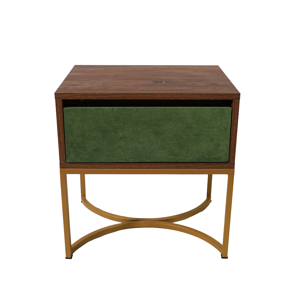 Ανανεώστε το υπνοδωμάτιό σας με αυτό το σύγχρονο και εκλεπτυσμένο κομοδίνο, που συνδυάζει τη φυσικότητα του ξύλου με την πολυτέλεια των μεταλλικών στοιχείων. Το σώμα του κομοδίνου διαθέτει φινίρισμα ξύλου σε φυσική απόχρωση, ενώ το εμπρός μέρος του συρταριού είναι επενδυμένο με ύφασμα σε κομψό σκούρο πράσινο, προσδίδοντας βάθος και χαρακτήρα. Η μεταλλική βάση σε απόχρωση χρυσού προσθέτει μια ζεστή, μοντέρνα νότα.