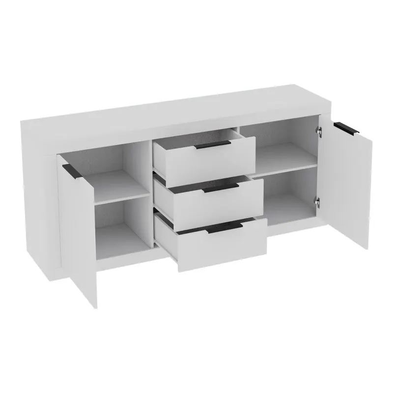 Ο μπουφές Doha αποτελεί μια εξαιρετική επιλογή για όσους επιθυμούν να συνδυάσουν μοντέρνο στυλ και πρακτική λειτουργικότητα στον χώρο τους. Με τον κομψό του σχεδιασμό και τη λευκή απόχρωση, προσφέρει μια αίσθηση καθαρότητας και φωτεινότητας που αναδεικνύει κάθε εσωτερικό χώρο. Διαθέτει τρία ευρύχωρα συρτάρια και δύο ντουλάπια, προσφέροντας άφθονο αποθηκευτικό χώρο για την τακτοποίηση αντικειμένων, σκευών ή λευκών ειδών. Η ανθεκτική κατασκευή του από μοριοσανίδα υψηλής ποιότητας με επένδυση μελαμίνης εξασφαλίζει αντοχή στον χρόνο και εύκολη συντήρηση.