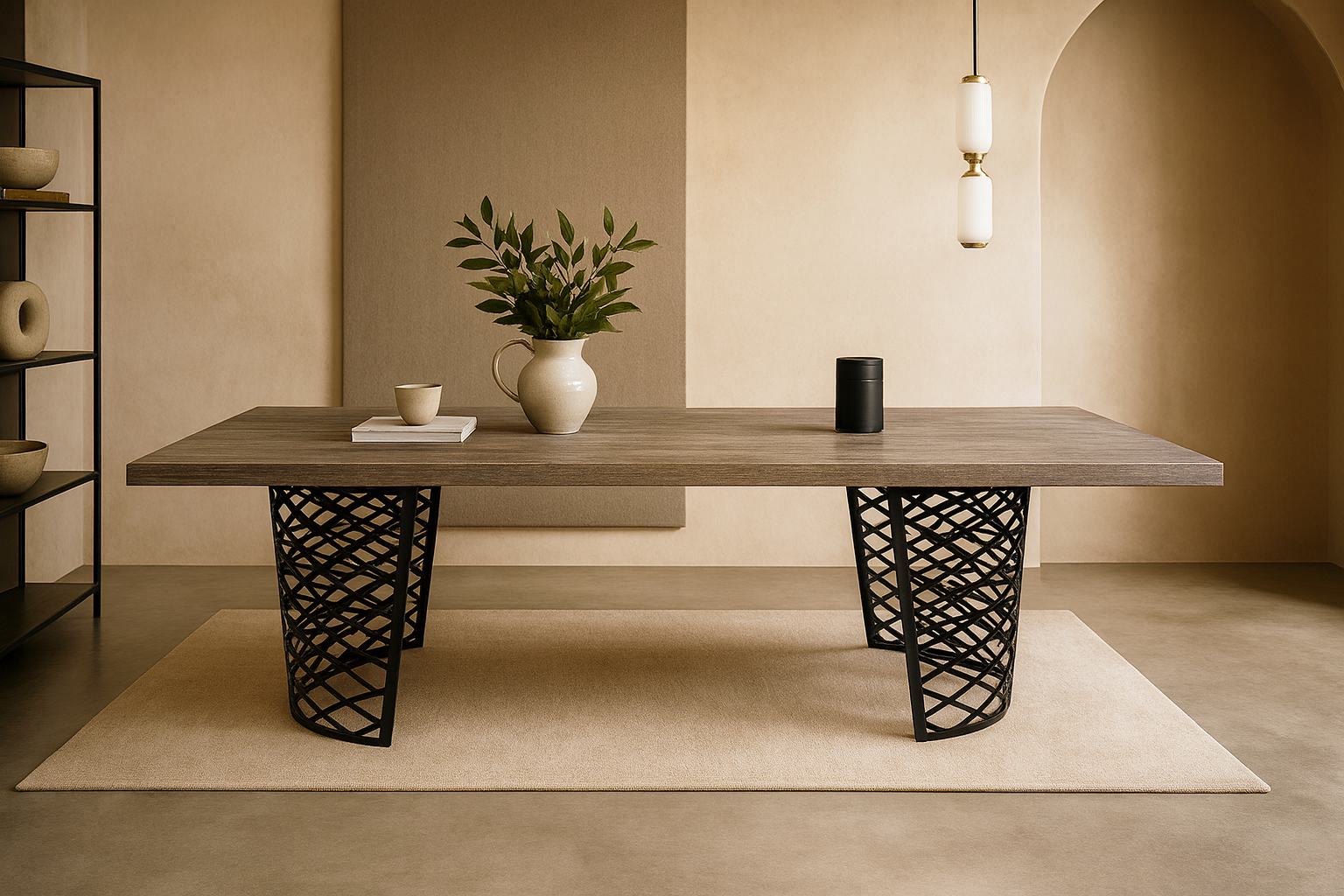 Η βάση αποτελεί το στοιχείο-υπογραφή του τραπεζιού. Πρόκειται για δύο ανεξάρτητα μεταλλικά πόδια με κυρτό σχήμα και τρισδιάστατο πλέγμα, εμπνευσμένο από γεωμετρικές φόρμες που συναντάμε στη σύγχρονη αρχιτεκτονική και τη γλυπτική.