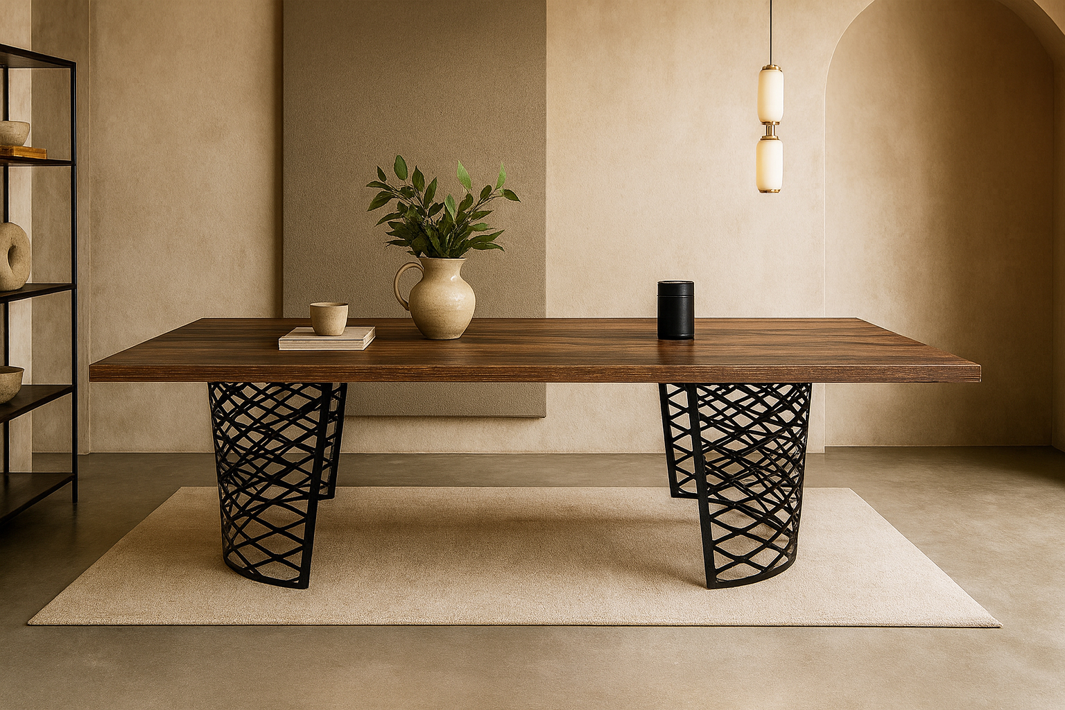 Η βάση αποτελεί το στοιχείο-υπογραφή του τραπεζιού. Πρόκειται για δύο ανεξάρτητα μεταλλικά πόδια με κυρτό σχήμα και τρισδιάστατο πλέγμα, εμπνευσμένο από γεωμετρικές φόρμες που συναντάμε στη σύγχρονη αρχιτεκτονική και τη γλυπτική.