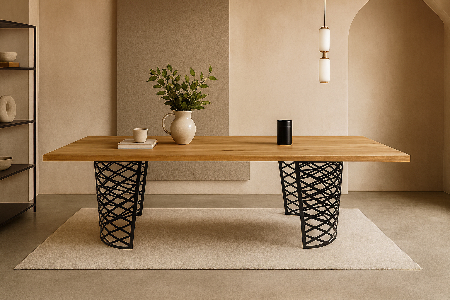 Η βάση αποτελεί το στοιχείο-υπογραφή του τραπεζιού. Πρόκειται για δύο ανεξάρτητα μεταλλικά πόδια με κυρτό σχήμα και τρισδιάστατο πλέγμα, εμπνευσμένο από γεωμετρικές φόρμες που συναντάμε στη σύγχρονη αρχιτεκτονική και τη γλυπτική.