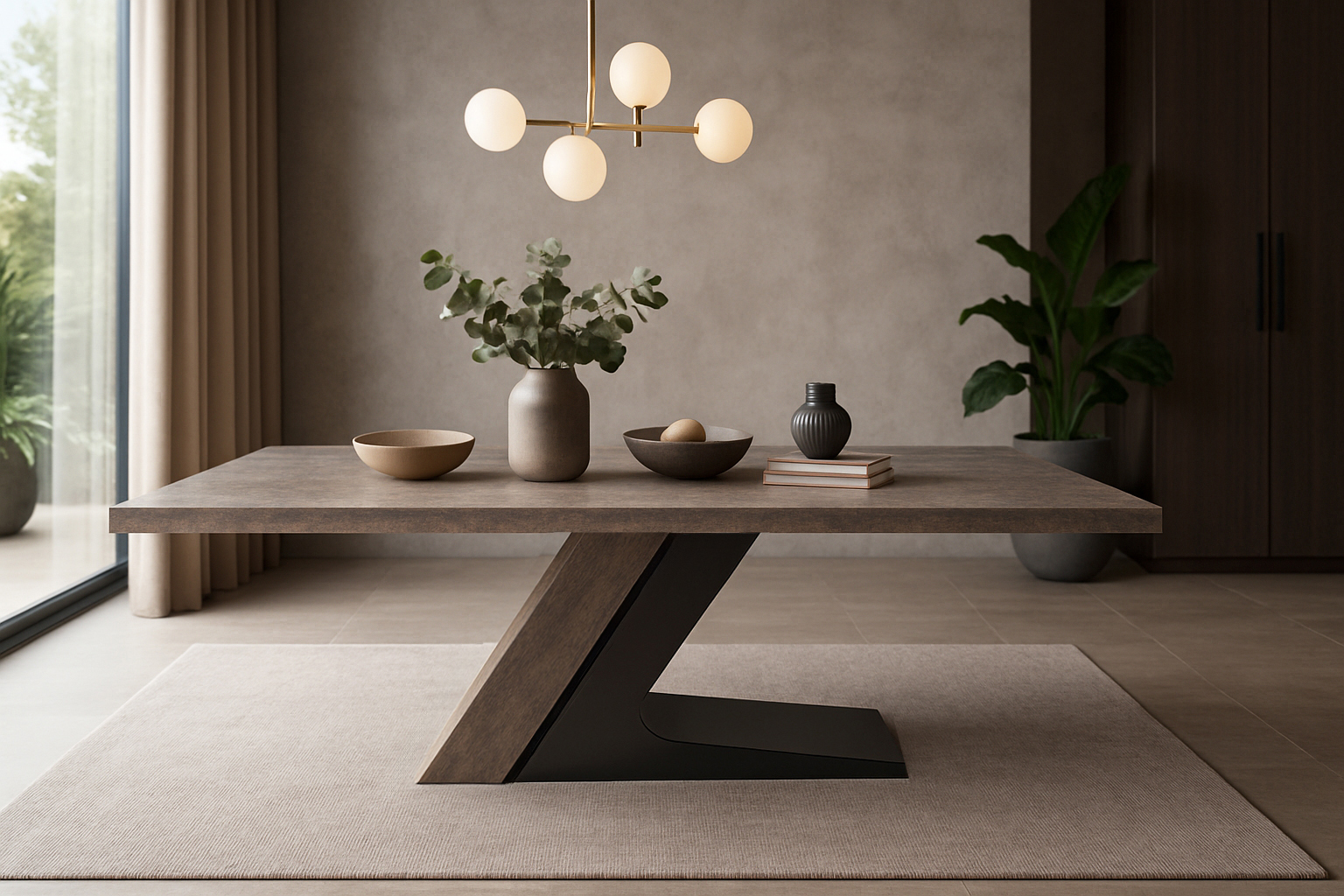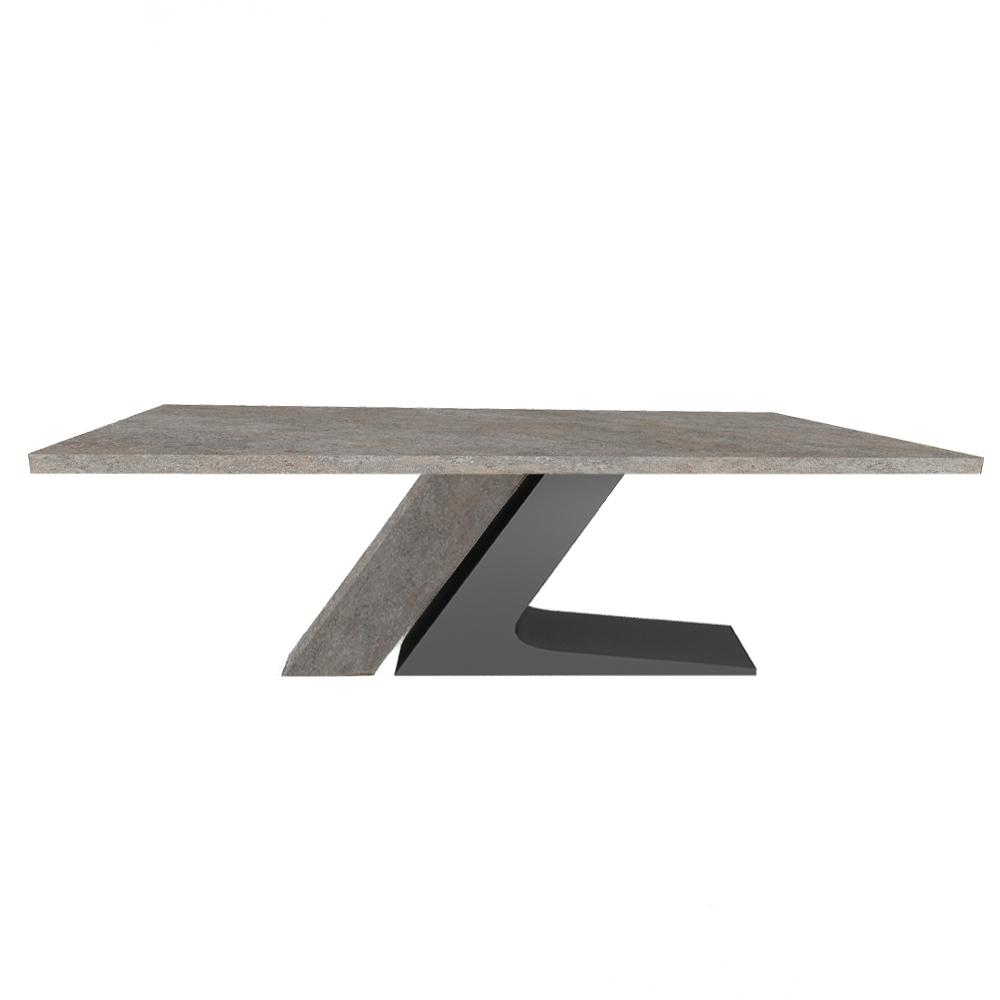Αναδείξτε τον χώρο σας με αυτή τη μοναδική τραπεζαρία που συνδυάζει μοντέρνα αισθητική και φυσική κομψότητα. Το τραπέζι διαθέτει εντυπωσιακή βάση σε σχήμα Ζ, που προσφέρει σταθερότητα και ξεχωριστό στυλ, ενώ η επιφάνεια από μελαμίνη σε όψη τσιμέντου σε σκούρο χρώμα αποπνέει ζεστασιά και διαχρονική φινέτσα.