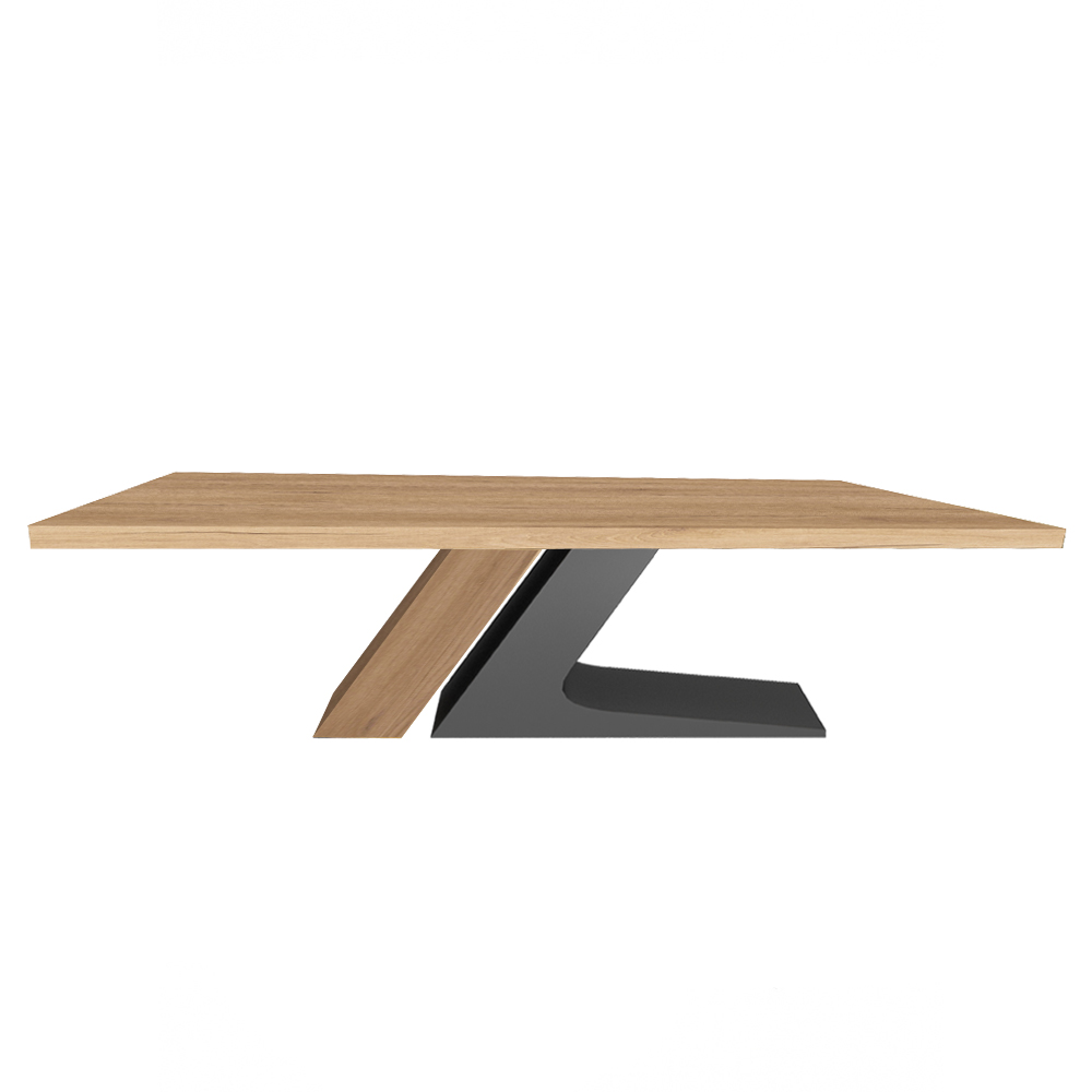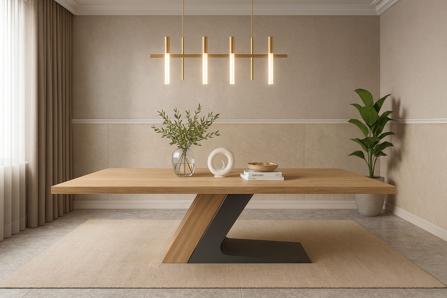 Αναδείξτε τον χώρο σας με αυτή τη μοναδική τραπεζαρία που συνδυάζει μοντέρνα αισθητική και φυσική κομψότητα. Το τραπέζι διαθέτει εντυπωσιακή βάση σε σχήμα Ζ, που προσφέρει σταθερότητα και ξεχωριστό στυλ, ενώ η επιφάνεια από μελαμίνη σε φυσική απόχρωση αποπνέει ζεστασιά και διαχρονική φινέτσα.