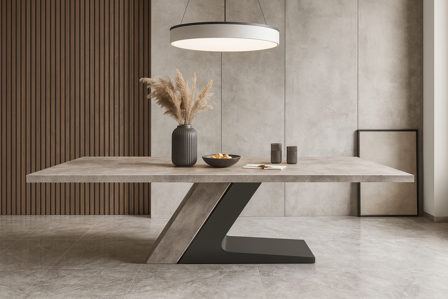 Αναδείξτε τον χώρο σας με αυτή τη μοναδική τραπεζαρία που συνδυάζει μοντέρνα αισθητική και φυσική κομψότητα. Το τραπέζι διαθέτει εντυπωσιακή βάση σε σχήμα Ζ, που προσφέρει σταθερότητα και ξεχωριστό στυλ, ενώ η επιφάνεια από μελαμίνη σε όψη τσιμέντου σε ανοιχτό χρώμα αποπνέει ζεστασιά και διαχρονική φινέτσα.