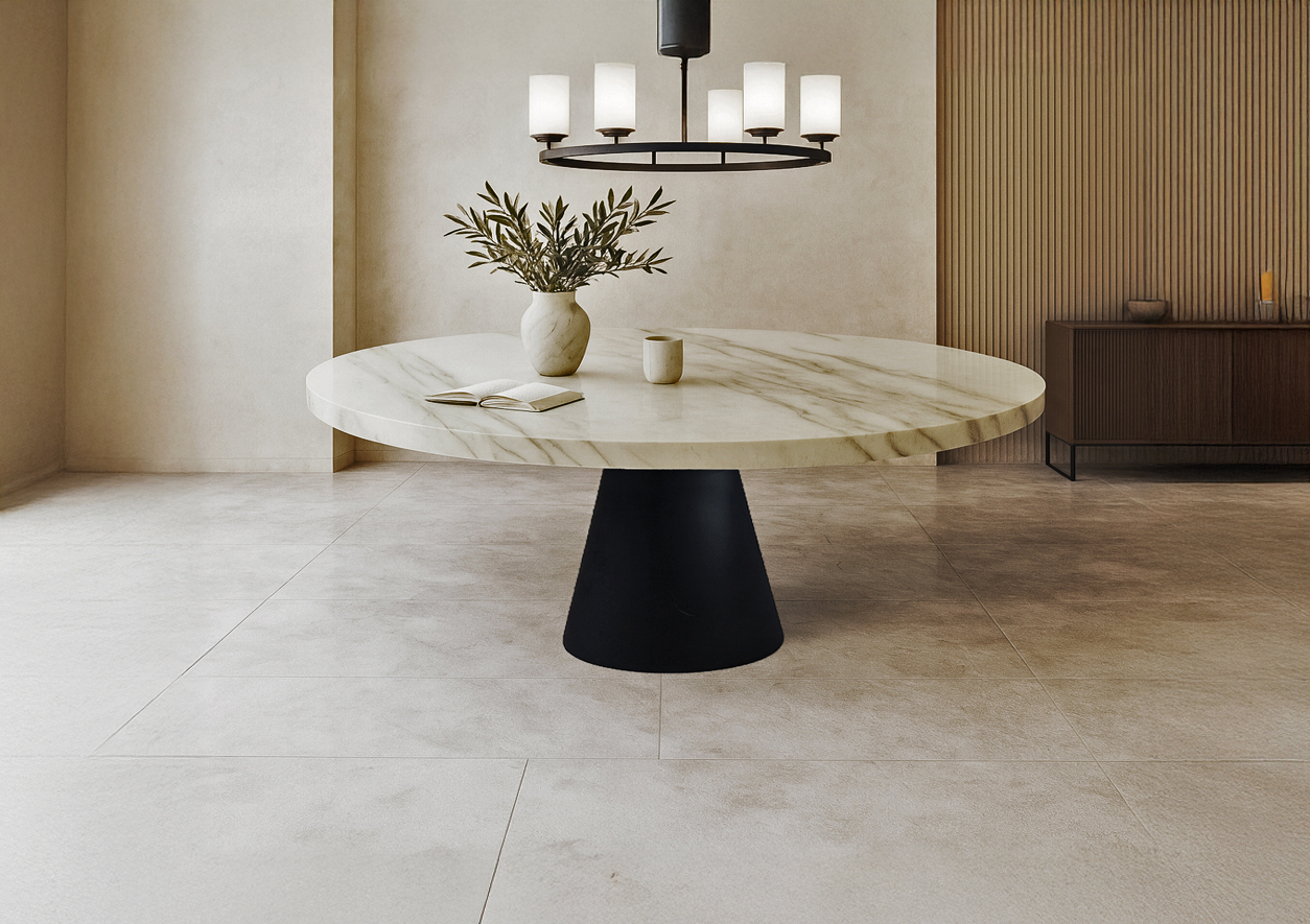 Η μοντέρνα κυκλική τραπεζαρία συνδυάζει την αυστηρή κομψότητα με την υψηλή λειτουργικότητα, αποτελώντας ιδανική επιλογή για κάθε χώρο που αναζητά μινιμαλιστική πολυτέλεια. Η στιβαρή επιφάνειά της αποπνέει έναν διαχρονικό χαρακτήρα, ενώ η μεταλλική κωνική βάση χαρίζει μοντέρνα αισθητική και σταθερότητα.
