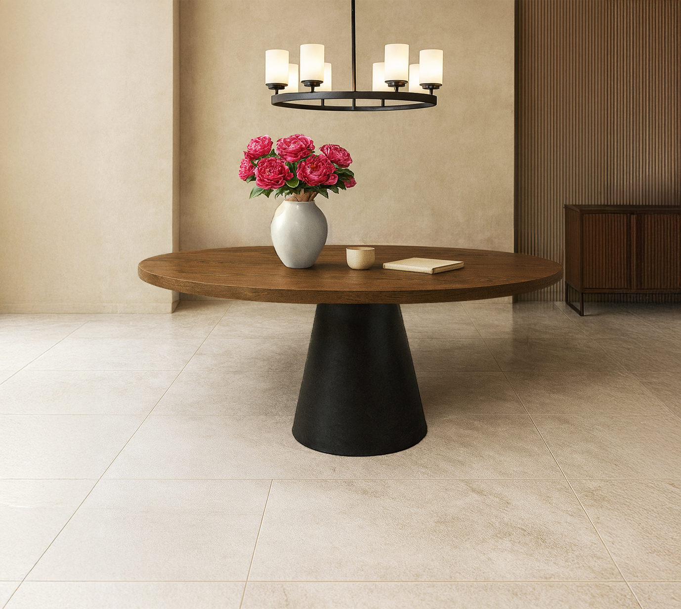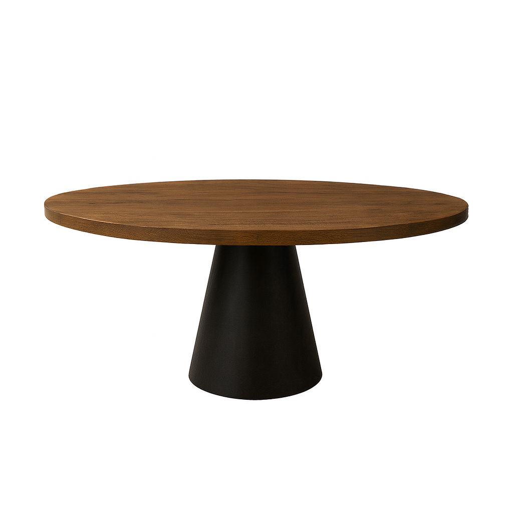 Η μοντέρνα κυκλική τραπεζαρία συνδυάζει την αυστηρή κομψότητα με την υψηλή λειτουργικότητα, αποτελώντας ιδανική επιλογή για κάθε χώρο που αναζητά μινιμαλιστική πολυτέλεια. Η στιβαρή επιφάνειά της αποπνέει έναν διαχρονικό χαρακτήρα, ενώ η μεταλλική κωνική βάση χαρίζει μοντέρνα αισθητική και σταθερότητα.