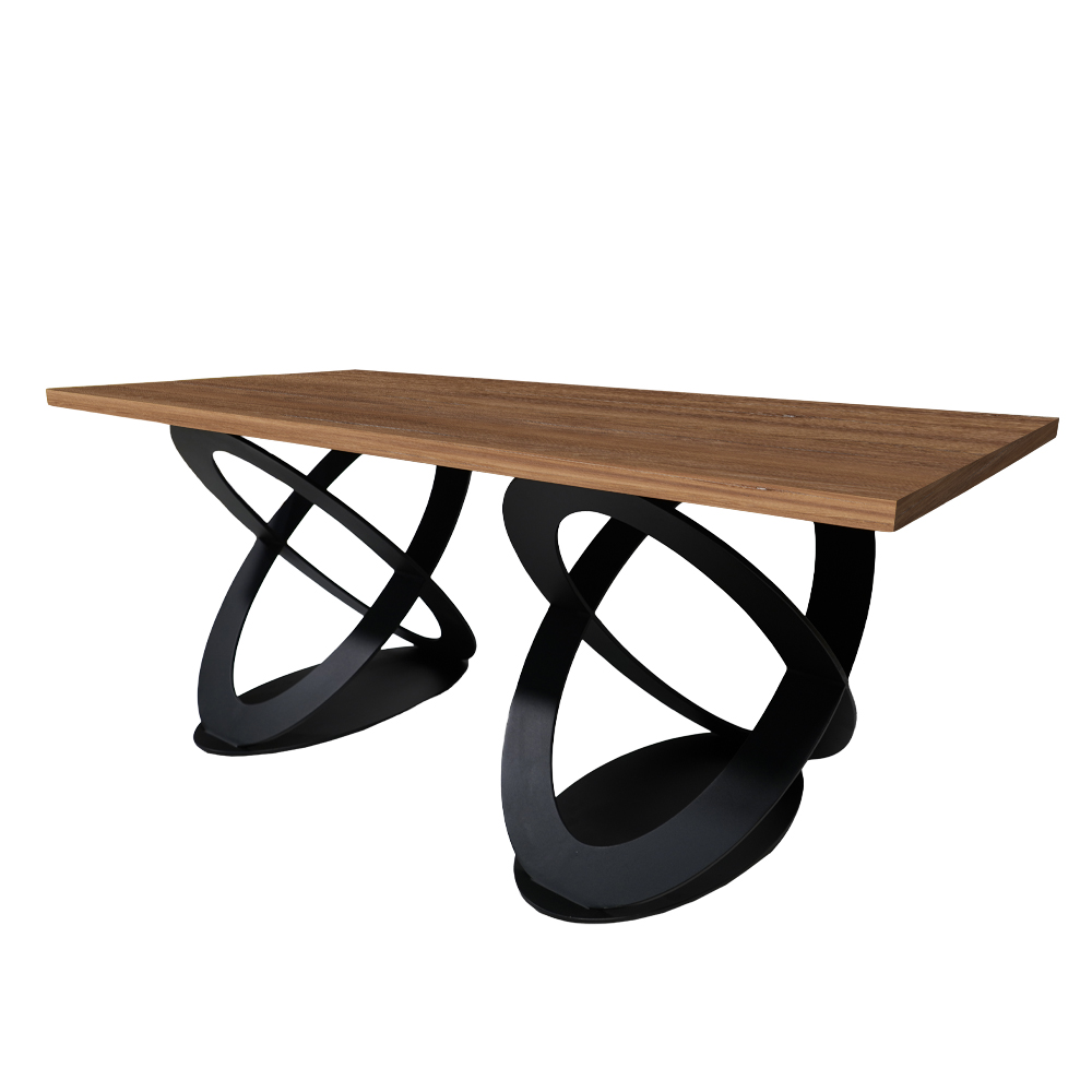 Η βάση από μαύρο μεταλλικό στοιχείο με καλλιτεχνικό, καμπυλωτό σχεδιασμό προσφέρει σταθερότητα και ξεχωριστή αισθητική, ιδανική για μοντέρνους ή industrial χώρους.