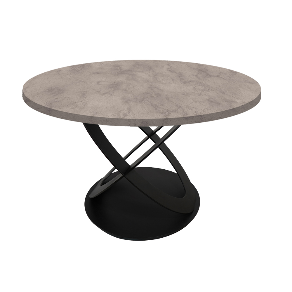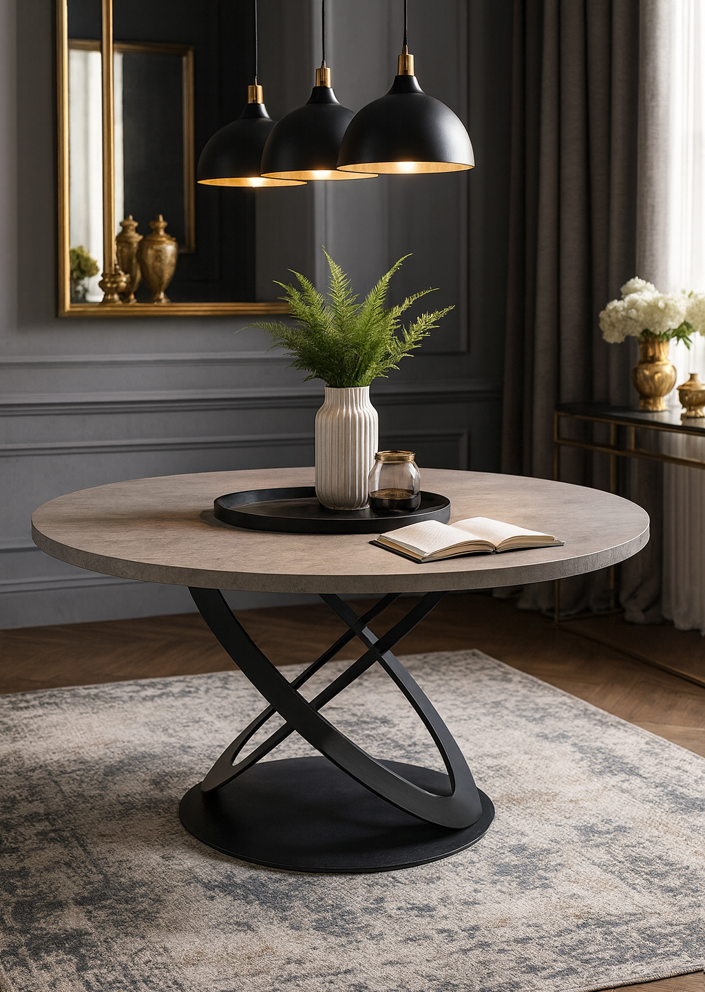 Επιφάνεια: Στρογγυλή επιφάνεια από υψηλής ποιότητας μελαμινη με όψη τσιμέντου σε ανοιχτό χρώμα, που προσδίδει ζεστασιά και κομψότητα.