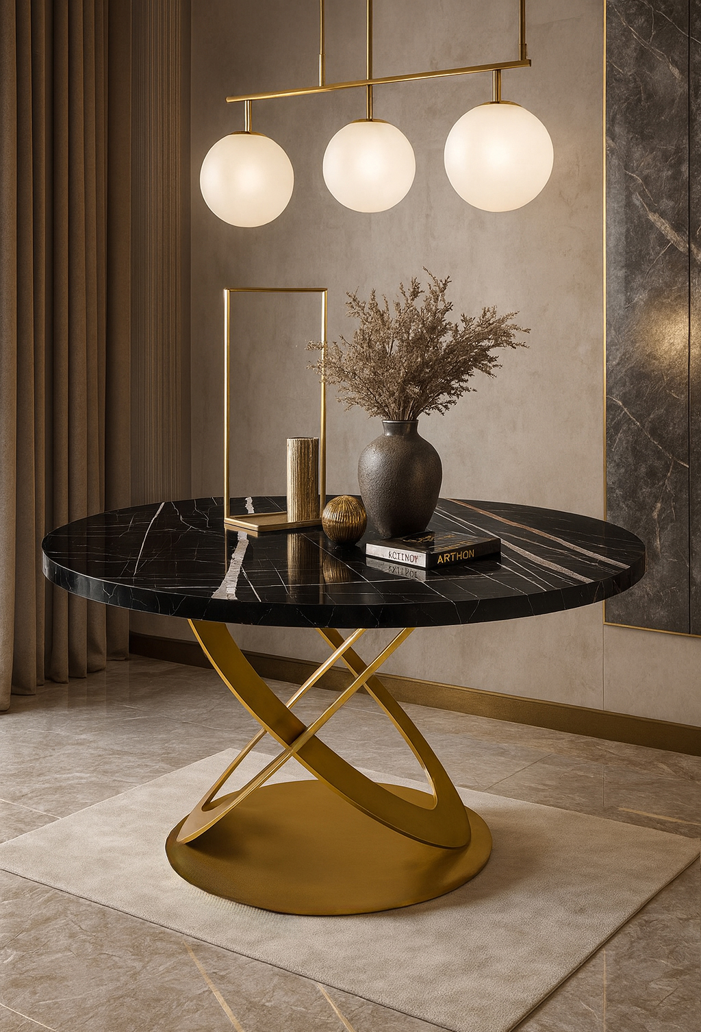 Επιφάνεια: Στρογγυλή επιφάνεια από υψηλής ποιότητας μελαμινη με όψη μαύρου μάρμαρου, που προσδίδει ζεστασιά και κομψότητα.