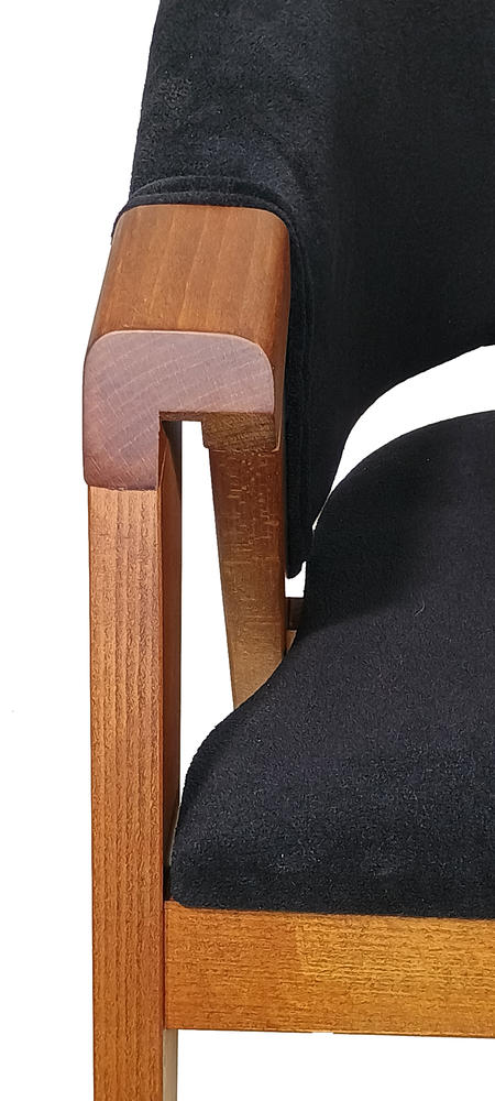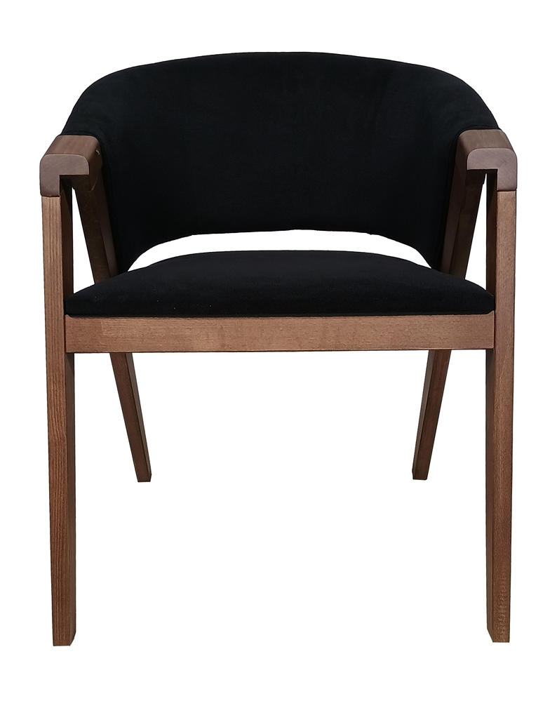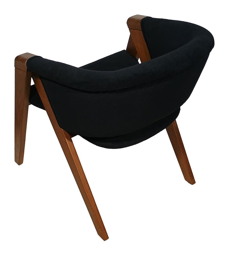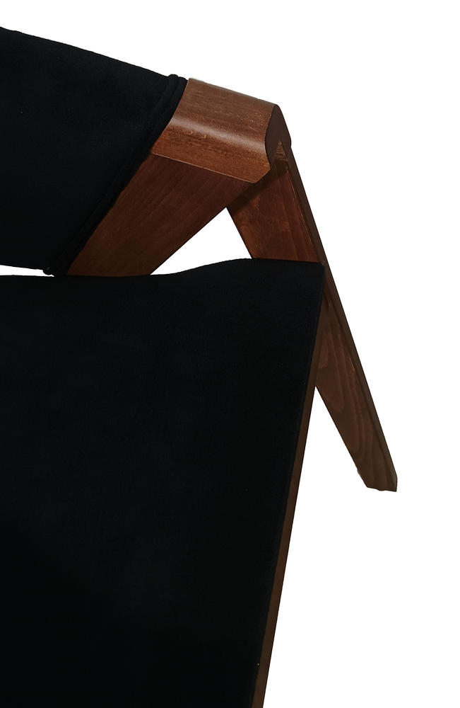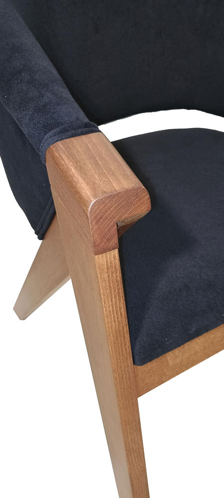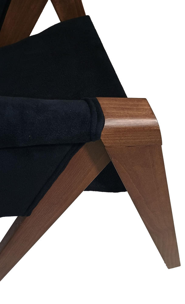 Αυτή η καρέκλα συνδυάζει μοντέρνο σχεδιασμό με φυσικά υλικά. Η βάση και τα πόδια είναι κατασκευασμένα από ξύλο, δίνοντας μια αίσθηση σταθερότητας και κομψότητας. Η πλάτη και το κάθισμα είναι επενδεδυμένα με μαλακό, βελούδινο ύφασμα σε μαύρο χρώμα, προσφέροντας άνεση και ζεστασιά. Η πλάτη είναι κυρτή και αγκαλιάζει την πλάτη του χρήστη, ενισχύοντας την εργονομία της καρέκλας. Ο συνδυασμός ξύλου και υφάσματος δημιουργεί μια διαχρονική αισθητική που ταιριάζει τόσο σε μοντέρνους όσο και σε πιο κλασικούς χώρους.