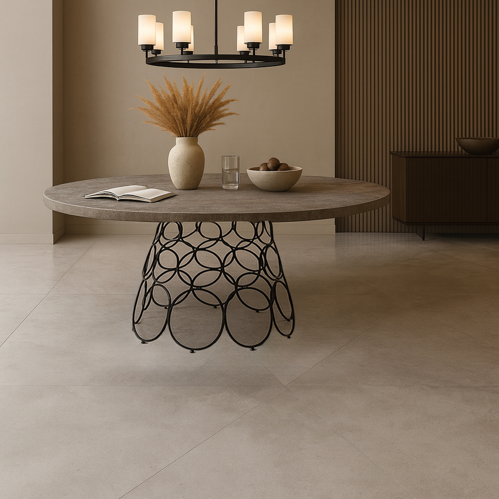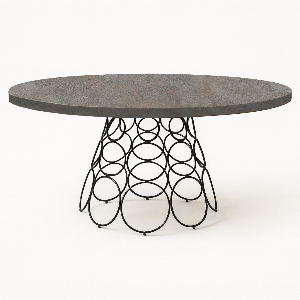 Αναβαθμίστε την αισθητική του χώρου σας με αυτό το εντυπωσιακό στρογγυλό σέτ τραπεζαρίας, το οποίο συνδυάζει industrial ύφος με σύγχρονο σχεδιασμό της μεταλλικής βάσης. H καλλιτεχνική μεταλλική βάση με κυκλικό μοτίβο δημιουργεί μια αίσθηση ελαφρότητας και κομψότητας ενώ οι καρέκλες με υφασμάτινη επένδυση και μοντέρνο σχεδιασμό εξασφαλίζουν άνεση και στυλ καθιστώντας το τραπέζι ιδανικό για elegant τραπεζαρίες, πολυτελή διαμερίσματα ή επαγγελματικούς χώρους υψηλής αισθητικής.