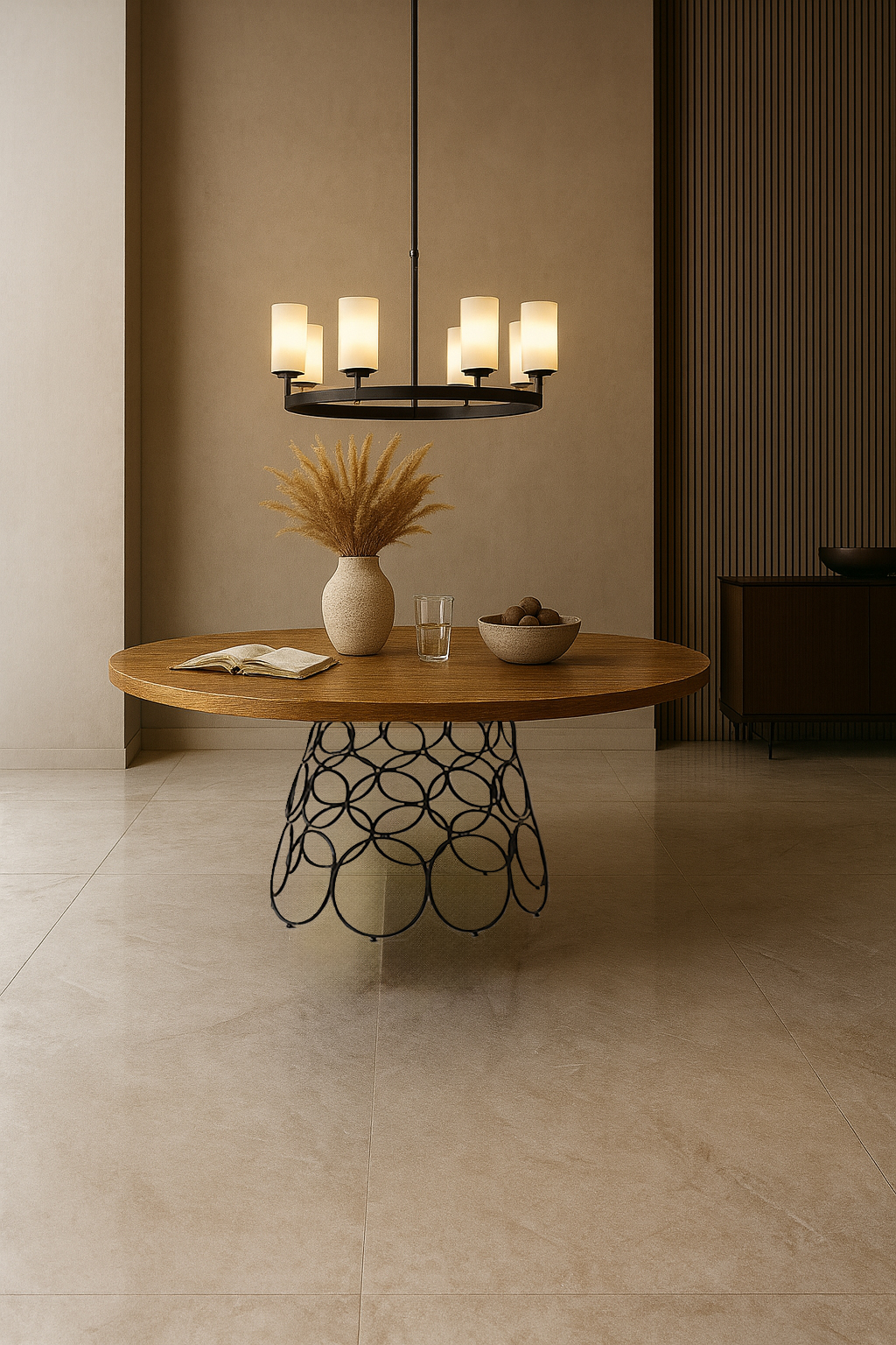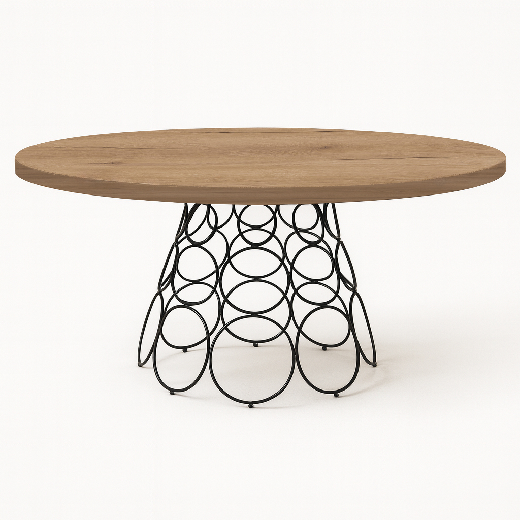 Αναβαθμίστε την αισθητική του χώρου σας με αυτό το εντυπωσιακό στρογγυλό σέτ τραπεζαρίας, το οποίο συνδυάζει τη φυσική ζεστασιά του ξύλου με τον σύγχρονο σχεδιασμό της μεταλλικής βάσης. H καλλιτεχνική μεταλλική βάση με κυκλικό μοτίβο δημιουργεί μια αίσθηση ελαφρότητας και κομψότητας ενώ οι καρέκλες με υφασμάτινη επένδυση και μοντέρνο σχεδιασμό εξασφαλίζουν άνεση και στυλ καθιστώντας το τραπέζι ιδανικό για elegant τραπεζαρίες, πολυτελή διαμερίσματα ή επαγγελματικούς χώρους υψηλής αισθητικής.