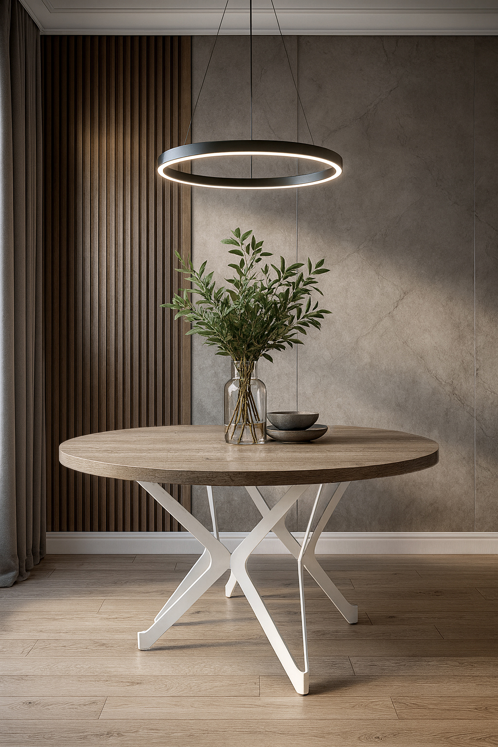 Αναδείξτε τον χώρο σας με αυτό το κομψό και σύγχρονο τραπέζι τραπεζαρίας. Η επιφάνειά του είναι κατασκευασμένη από ανθεκτική μελαμίνη με ανοιχτή απόχρωση , ενώ η γεωμετρική του μεταλλική βάση προσφέρει μοναδική αισθητική και σταθερότητα.