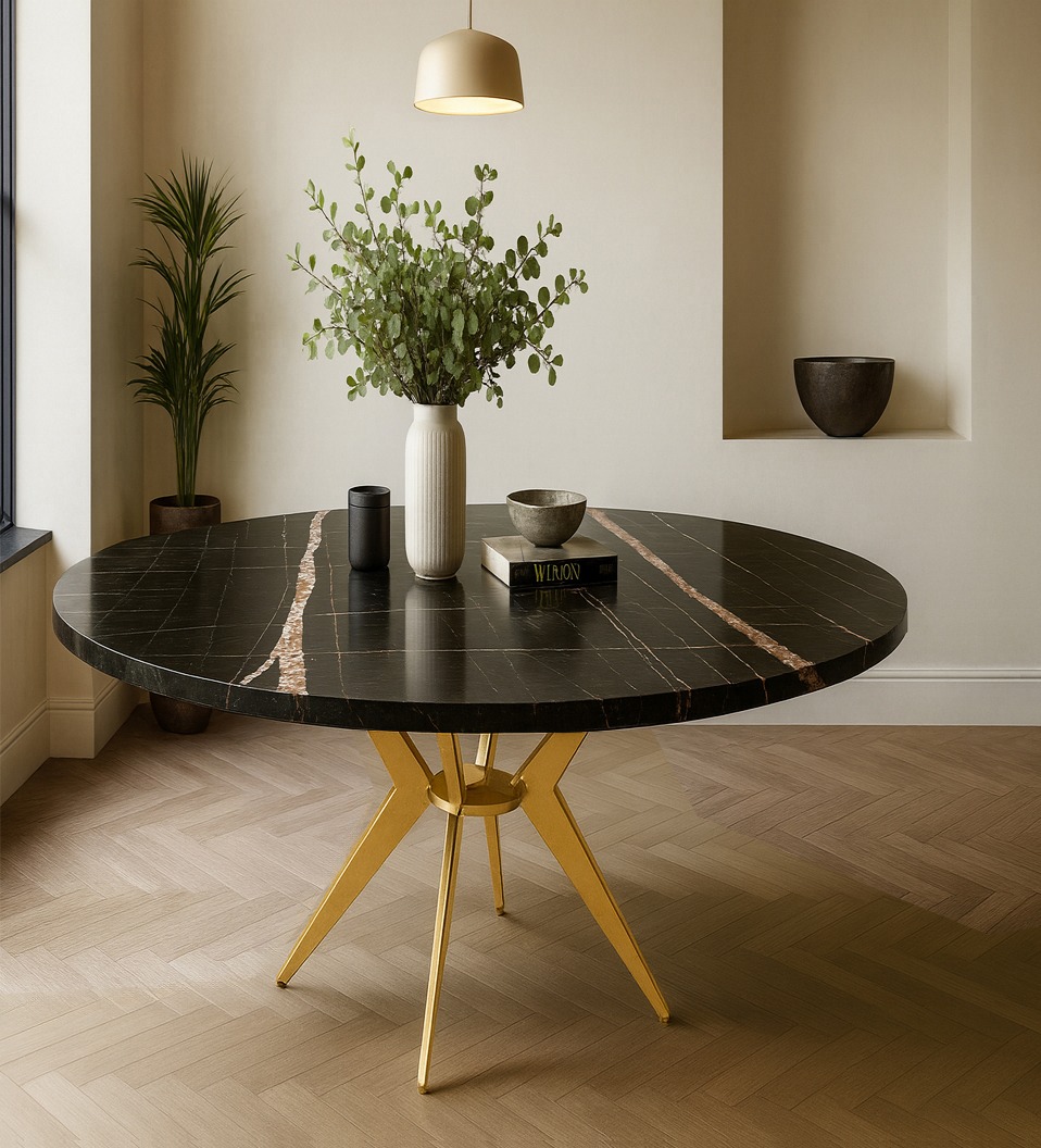 Κομψό και λειτουργικό σετ τραπεζαρίας που συνδυάζει μοντέρνο design και άνεση. Το στρογγυλό τραπέζι διαθέτει επιφάνεια με όψη μαύρου μάρμαρου και μεταλλική βάση τύπου «αστέρι» για σταθερότητα και στυλ. Συνοδεύεται από καρέκλες με υφασμάτινη επένδυση και μεταλλικό σκελετό.