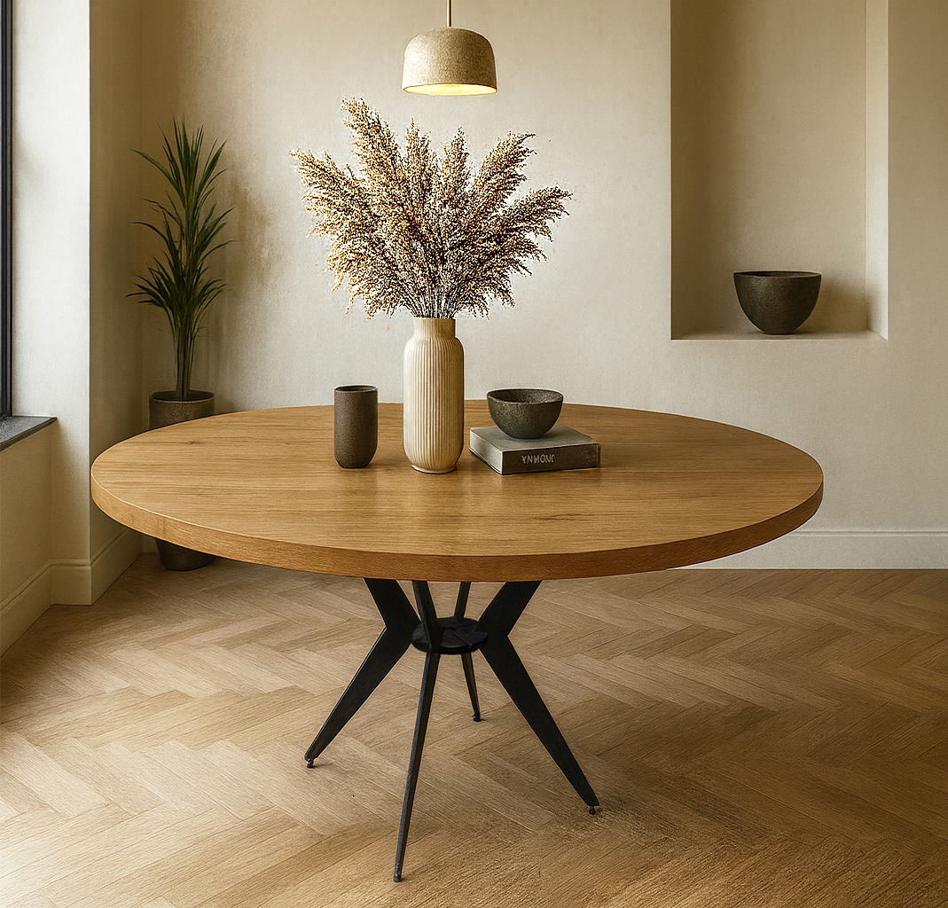 Κομψό και λειτουργικό σετ τραπεζαρίας που συνδυάζει μοντέρνο design και άνεση. Το στρογγυλό τραπέζι διαθέτει επιφάνεια σε φυσική απόχρωση ξύλου και μεταλλική βάση τύπου «αστέρι» για σταθερότητα και στυλ. Συνοδεύεται από καρέκλες με υφασμάτινη επένδυση και μεταλλικό σκελετό.