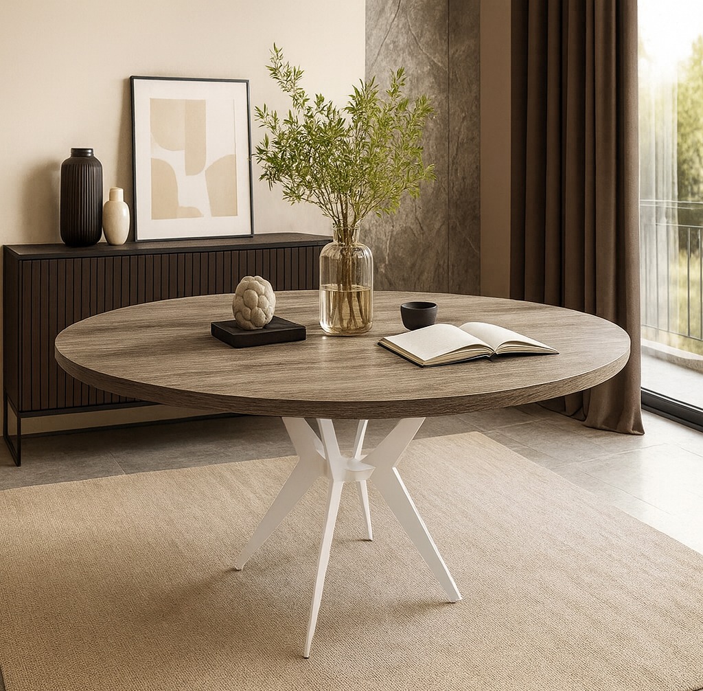 Κομψό και λειτουργικό σετ τραπεζαρίας που συνδυάζει μοντέρνο design και άνεση. Το στρογγυλό τραπέζι διαθέτει επιφάνεια σε ανοιχτή απόχρωση ξύλου και μεταλλική βάση τύπου «αστέρι» για σταθερότητα και στυλ. Συνοδεύεται από καρέκλες με υφασμάτινη επένδυση και μεταλλικό σκελετό.