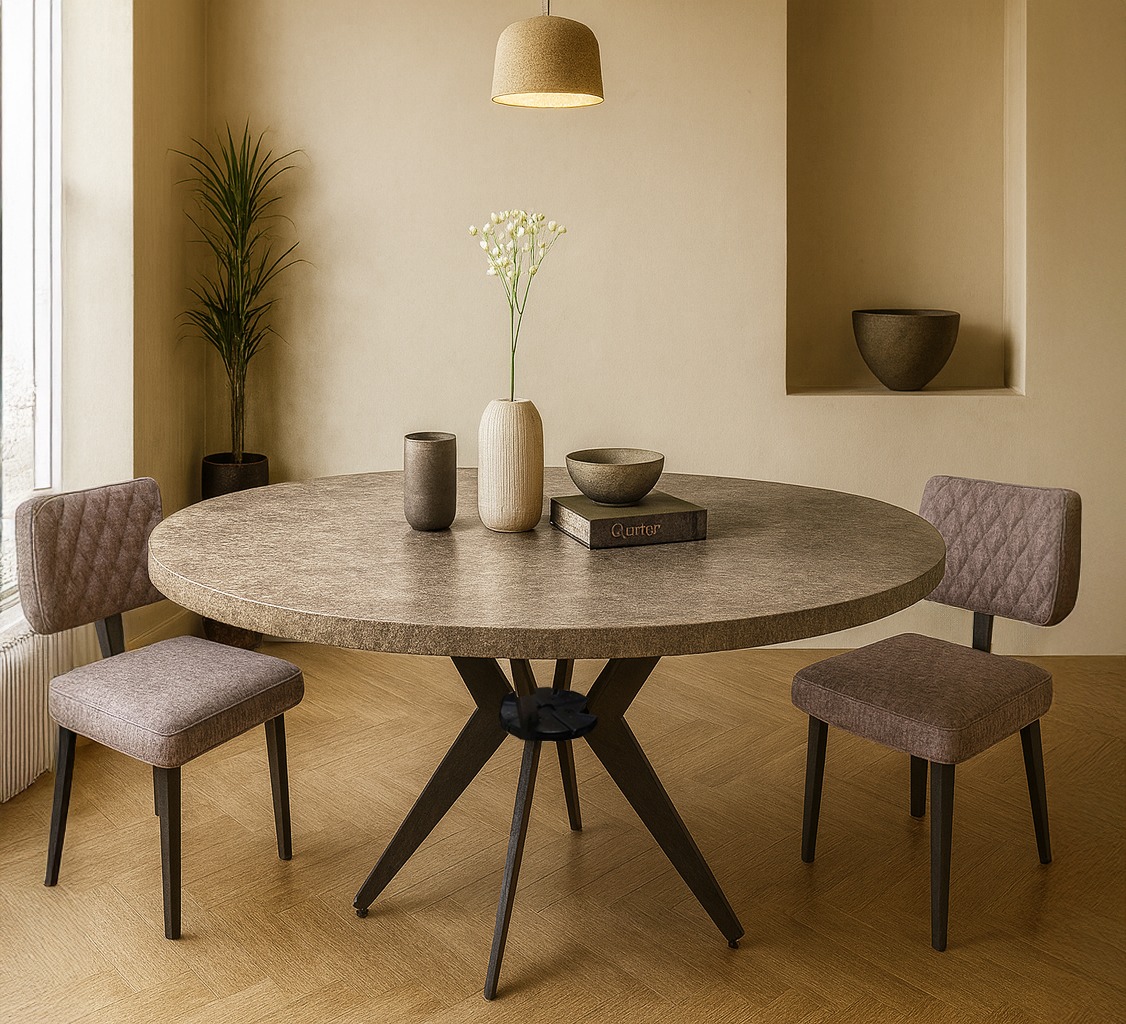 Κομψό και λειτουργικό σετ τραπεζαρίας που συνδυάζει μοντέρνο design και άνεση. Το στρογγυλό τραπέζι διαθέτει επιφάνεια με όψη τσιμέντου σε ανοιχτό χρώμα και μεταλλική βάση τύπου «αστέρι» για σταθερότητα και στυλ. Συνοδεύεται από καρέκλες με υφασμάτινη επένδυση και μεταλλικό σκελετό.