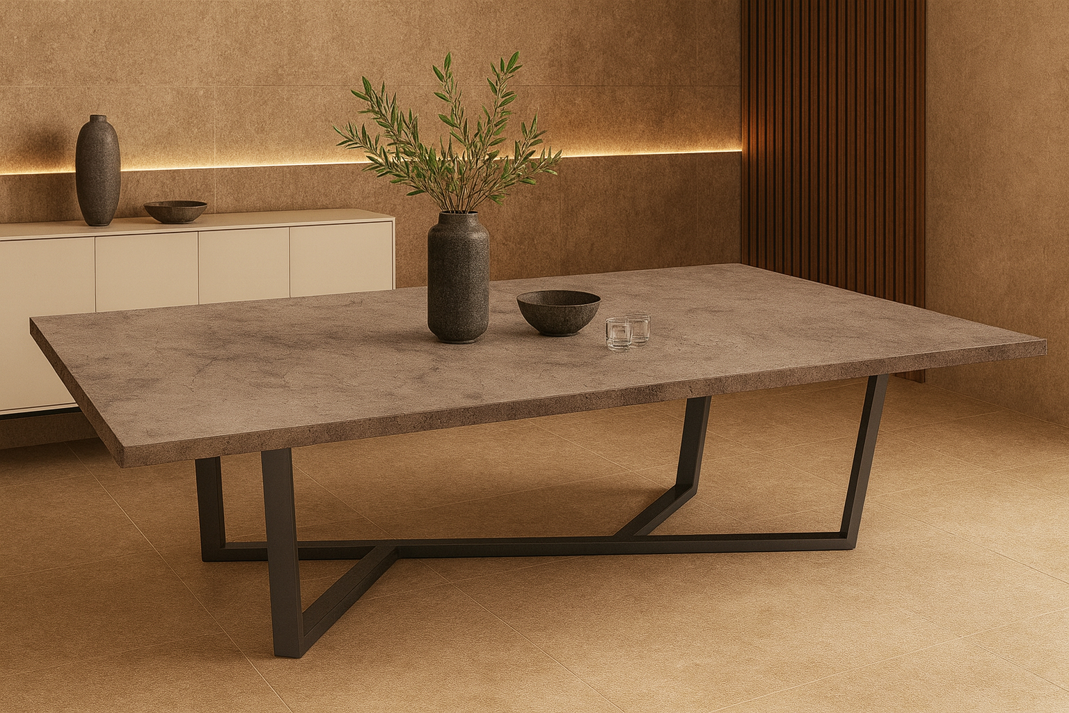 - Επιφάνεια τραπεζιού: Κατασκευασμένη από υψηλής ποιότητας μελαμίνη με όψη τσιμέντου σε ανοιχτό χρώμα, προσφέρει πολυτέλεια και διαχρονική αισθητική στον χώρο.