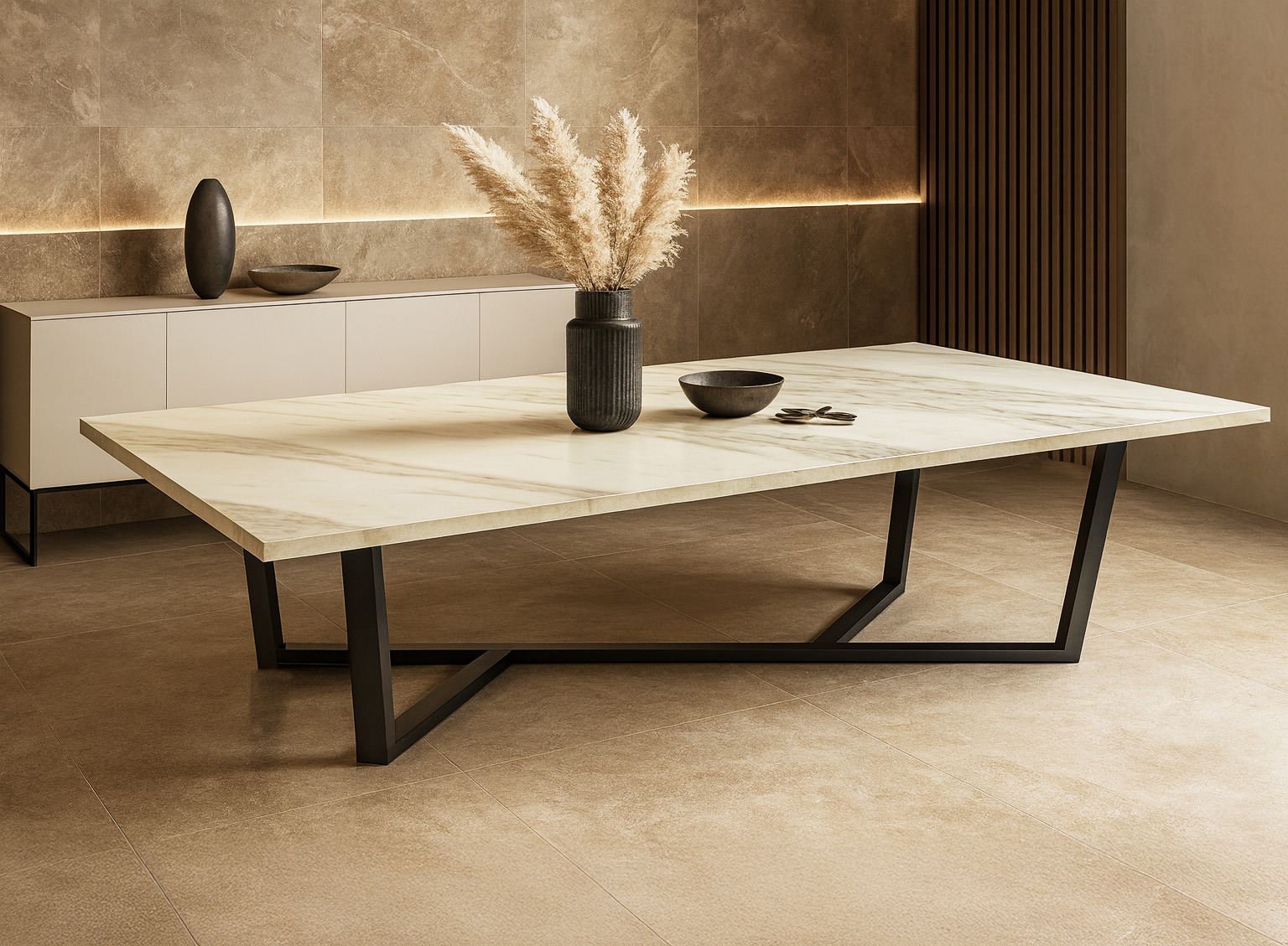 Το χαρακτηριστικό “σταυρωτό” παιχνίδι των μεταλλικών βάσεων δημιουργεί έναν ιδιαίτερο οπτικό ρυθμό και δίνει στο τραπέζι ένα στοιχείο δυναμισμού.