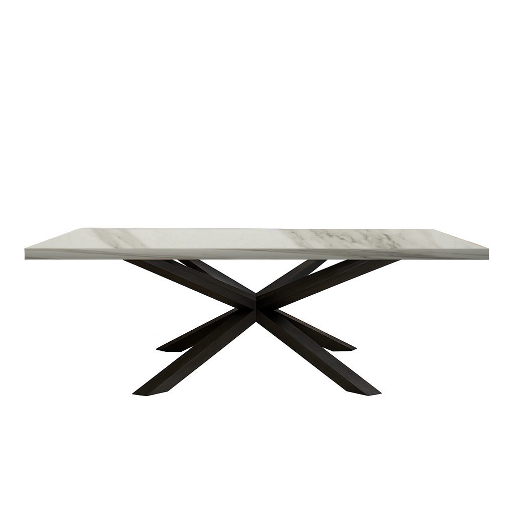 Η επιφάνεια από μελαμίνη με όψη λευκού μάρμαρου προσδίδει πολυτέλεια και διαχρονικότητα, ενώ η εντυπωσιακή βάση σε σχήμα σταυρού από μαύρο μέταλλο προσφέρει μοναδική σταθερότητα και σύγχρονο χαρακτήρα.