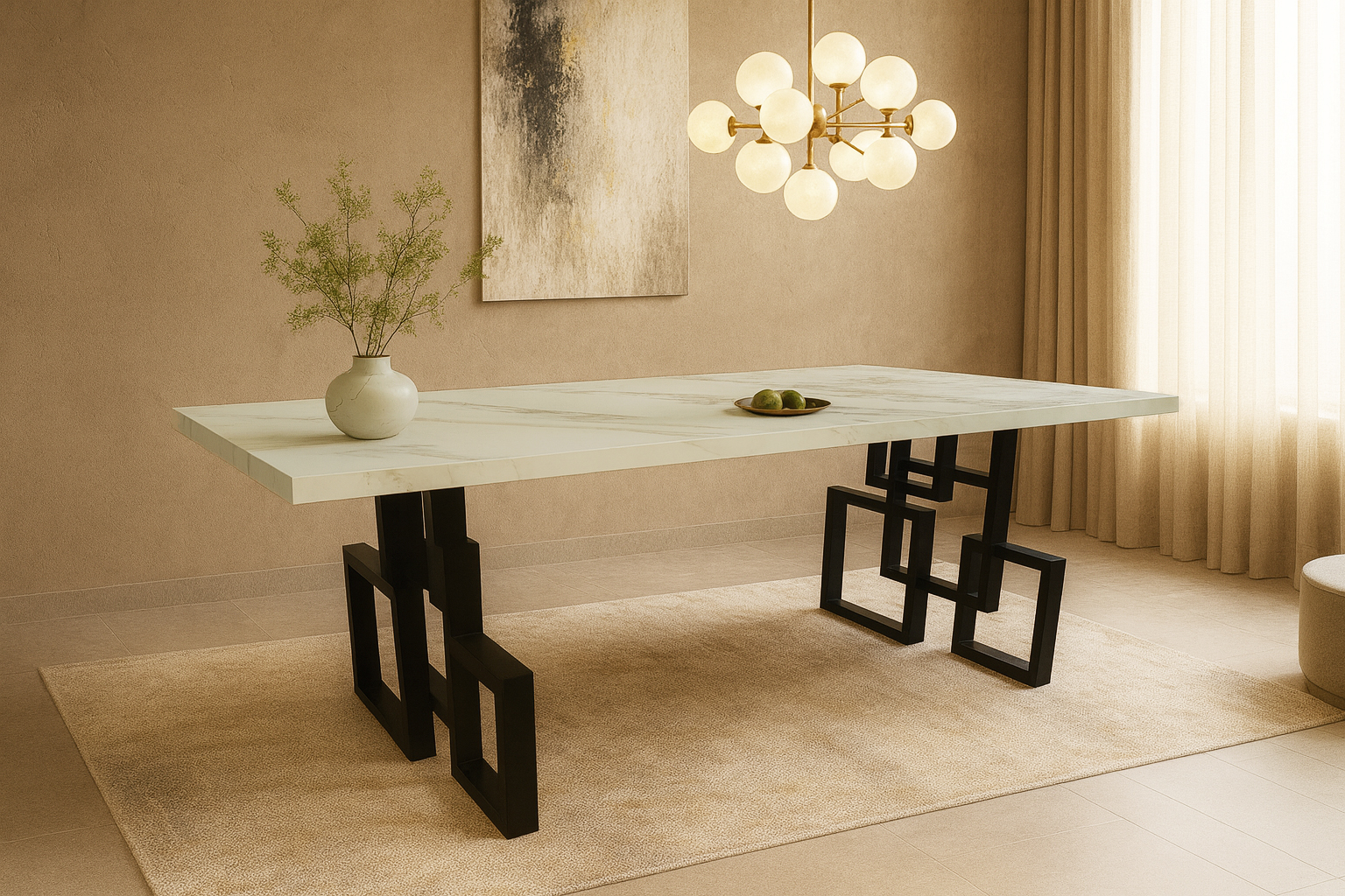 Αναβαθμίστε τον χώρο της τραπεζαρίας σας με αυτό το κομψό και μοντέρνο σετ τραπεζαρίας που συνδυάζει πολυτελή όψη σε λευκό μάρμαρο στην επιφάνεια με εντυπωσιακή μεταλλική βάση σε μαύρο ματ φινίρισμα. Ιδανικό για σύγχρονες κατοικίες, επαγγελματικούς χώρους ή χώρους φιλοξενίας που επιζητούν στυλ χωρίς υπερβολές.