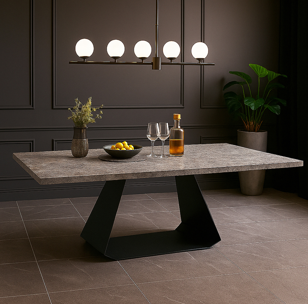 Αναδείξτε τον χώρο σας με αυτό το εκλεπτυσμένο σετ τραπεζαρίας, που συνδυάζει πολυτέλεια και λειτουργικότητα. Το τραπέζι διαθέτει εντυπωσιακή επιφάνεια από μελαμίνη με όψη τσιμέντου σε σκούρο χρώμα, προσφέροντας αίσθηση πολυτέλειας, κομψότητα και αντοχή. Η στιβαρή μεταλλική βάση σε μαύρο χρώμα χαρίζει σταθερότητα και μοντέρνα αισθητική, ενώ οι καρέκλες με υφασμάτινη επένδυση και μοντέρνο σχεδιασμό εξασφαλίζουν άνεση και στυλ.