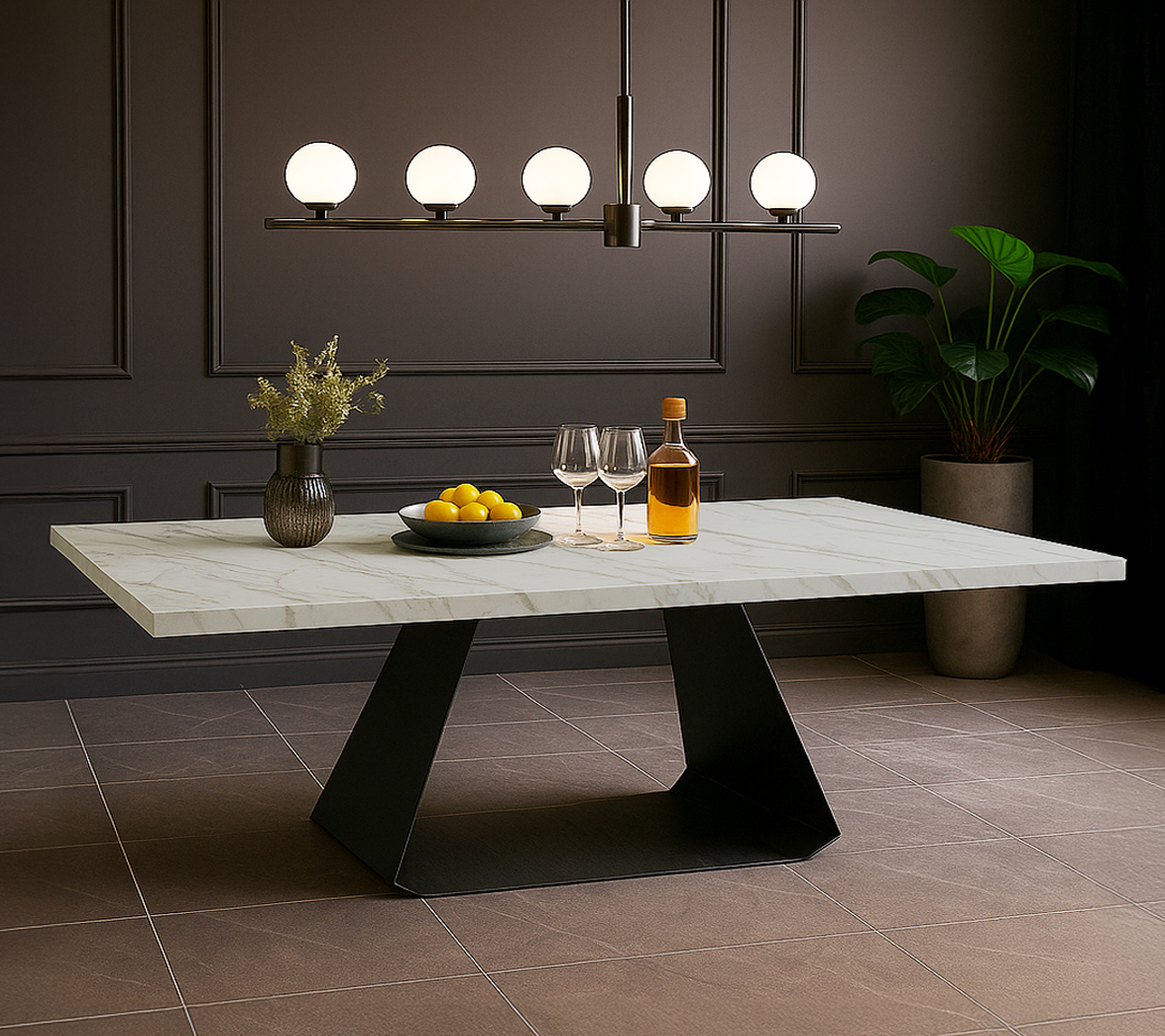 Αναδείξτε τον χώρο σας με αυτό το εκλεπτυσμένο σετ τραπεζαρίας, που συνδυάζει πολυτέλεια και λειτουργικότητα. Το τραπέζι διαθέτει εντυπωσιακή επιφάνεια από μελαμίνη με όψη λευκού μάρμαρου, προσφέροντας αίσθηση πολυτέλειας, κομψότητα και αντοχή. Η στιβαρή μεταλλική βάση σε μαύρο χρώμα χαρίζει σταθερότητα και μοντέρνα αισθητική, ενώ οι καρέκλες με υφασμάτινη επένδυση και μοντέρνο σχεδιασμό εξασφαλίζουν άνεση και στυλ.