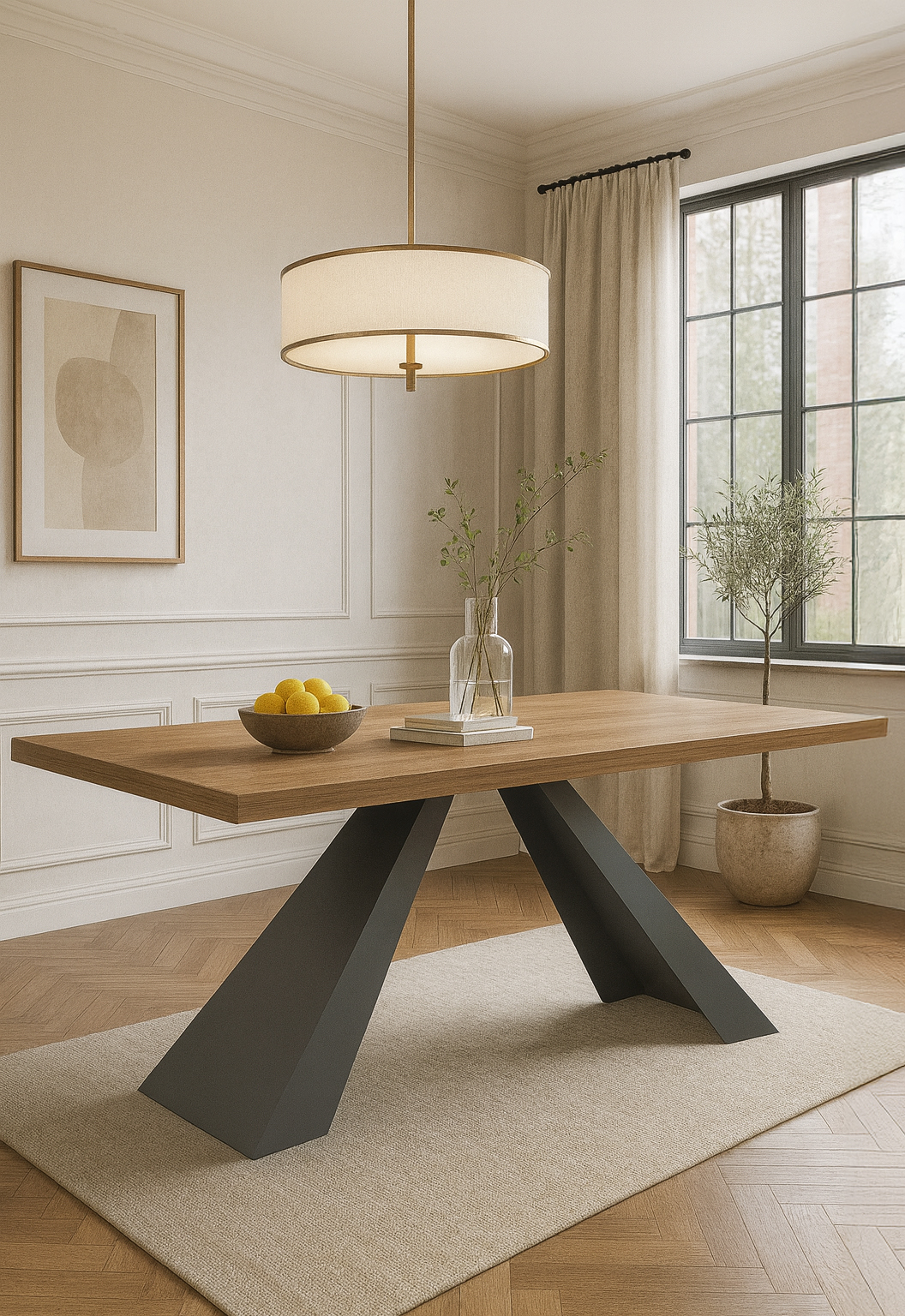 Ανανεώστε τον χώρο σας με ένα τραπέζι που συνδυάζει τον σύγχρονο σχεδιασμό με την ανθεκτικότητα και την αισθητική. Το τραπέζι αυτό ξεχωρίζει για την κομψή, επιφάνειά από υψηλής ποιότητας μελαμίνη του και την εντυπωσιακή, γεωμετρική μεταλλική βάση σε μαύρο χρώμα, προσφέροντας στιβαρότητα και χαρακτήρα στον χώρο.