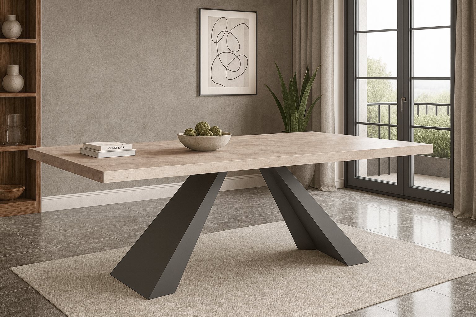 Ανανεώστε τον χώρο σας με ένα τραπέζι που συνδυάζει τον σύγχρονο σχεδιασμό με την ανθεκτικότητα και την αισθητική. Το τραπέζι αυτό ξεχωρίζει για την κομψή, επιφάνειά από υψηλής ποιότητας μελαμίνη του και την εντυπωσιακή, γεωμετρική μεταλλική βάση σε μαύρο χρώμα, προσφέροντας στιβαρότητα και χαρακτήρα στον χώρο.