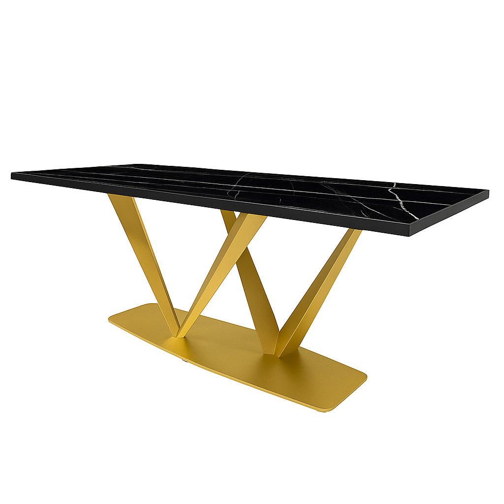 Η Μοντέρνα τραπεζαρία 2V υψηλής αισθητικής, σχεδιασμένη για να αναβαθμίσει κάθε σύγχρονο χώρο. Η επιφάνεια από μελαμίνη με όψη μαύρου μάρμαρου προσφέρει ζεστασιά και διαχρονικό χαρακτήρα, ενώ η στιβαρή μεταλλική βάση σε χρυσό ματ φινίρισμα, με γεωμετρικό σχεδιασμό, εξασφαλίζει σταθερότητα και εντυπωσιακή παρουσία.