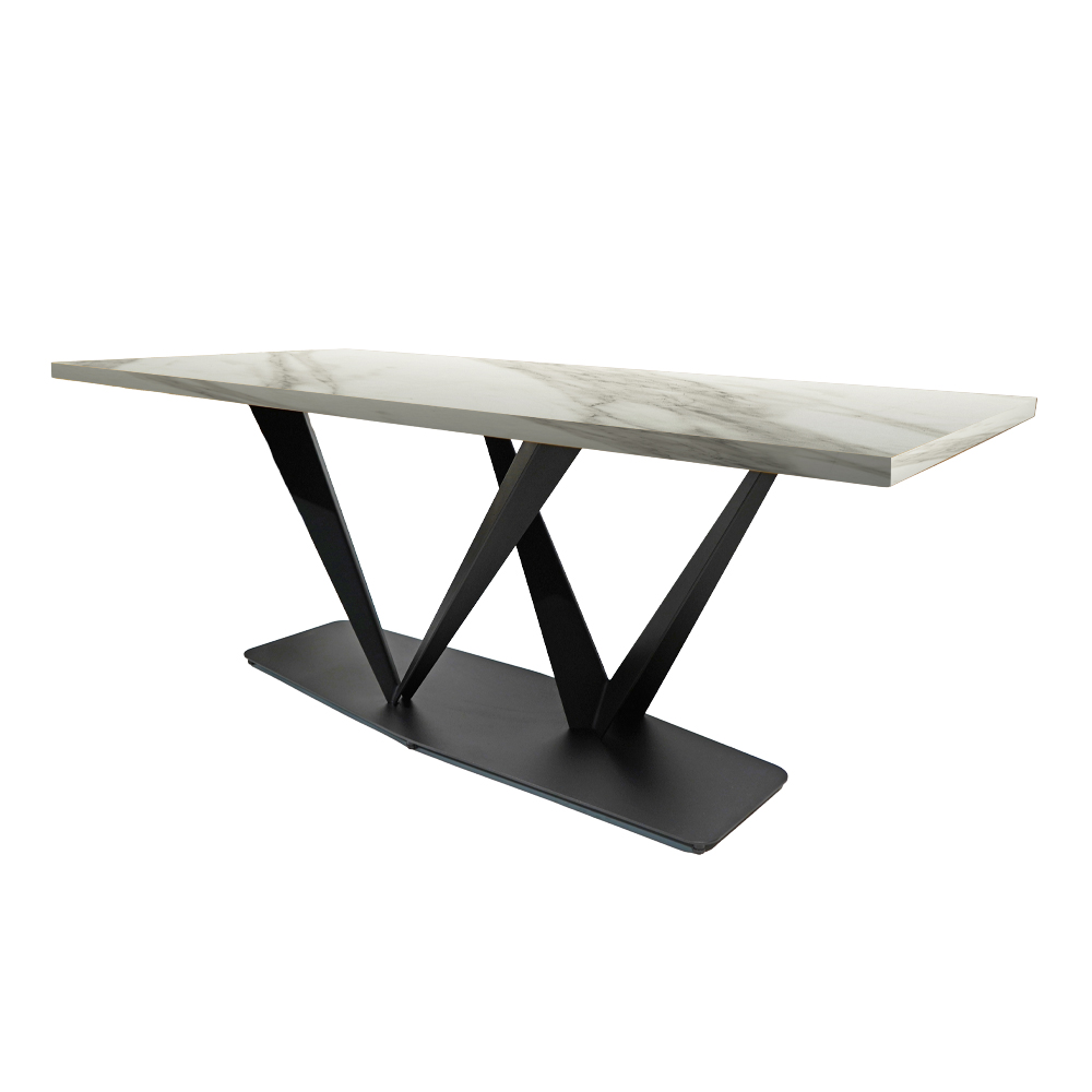 Η Μοντέρνα τραπεζαρία 2V υψηλής αισθητικής, σχεδιασμένη για να αναβαθμίσει κάθε σύγχρονο χώρο. Η επιφάνεια από μελαμίνη με όψη λευκού μάρμαρου προσφέρει ζεστασιά και διαχρονικό χαρακτήρα, ενώ η στιβαρή μεταλλική βάση σε μαύρο ματ φινίρισμα, με γεωμετρικό σχεδιασμό, εξασφαλίζει σταθερότητα και εντυπωσιακή παρουσία.