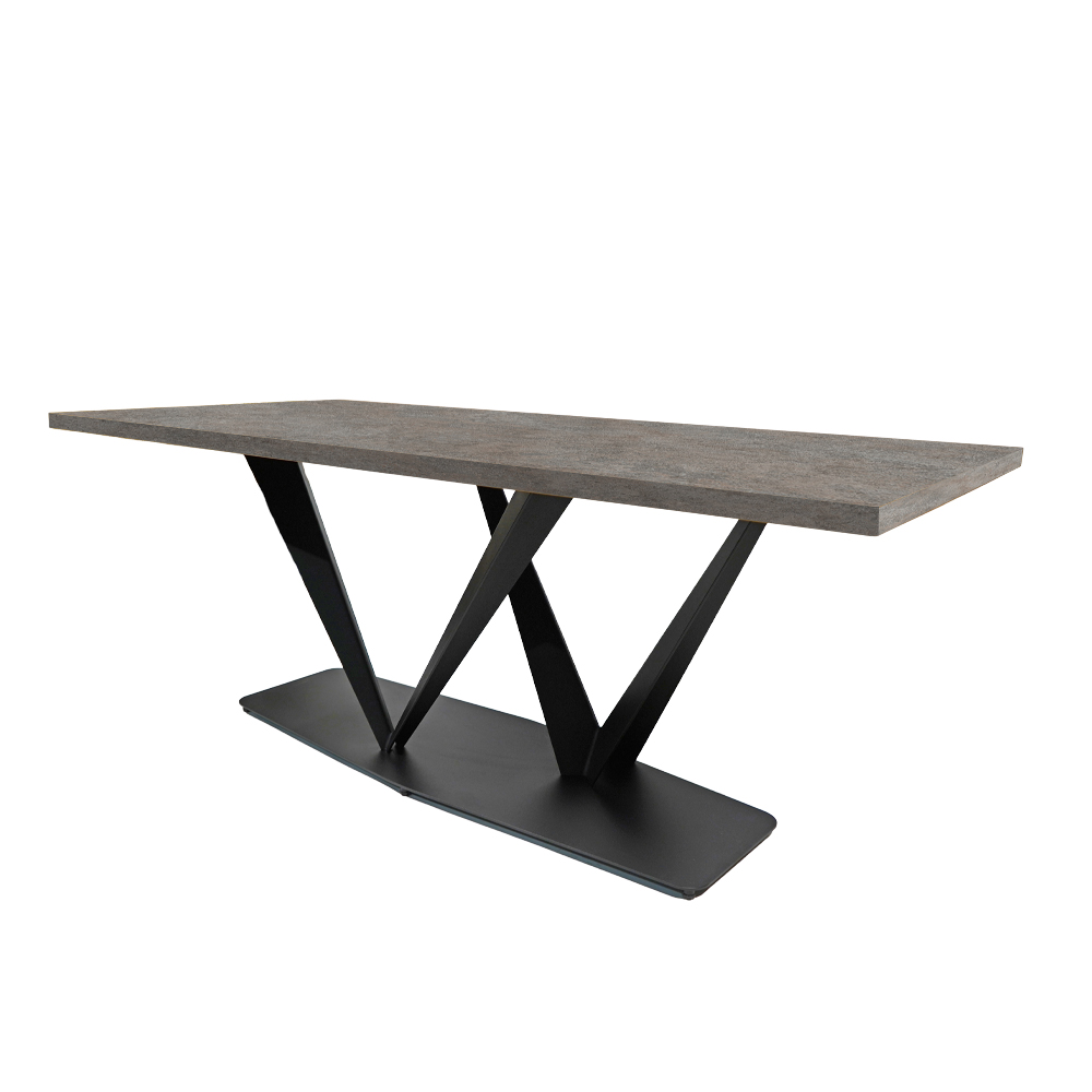 Η Μοντέρνα τραπεζαρία 2V υψηλής αισθητικής, σχεδιασμένη για να αναβαθμίσει κάθε σύγχρονο χώρο. Η επιφάνεια από μελαμίνη με όψη τσιμέντου σε σκούρο χρώμα προσφέρει ζεστασιά και διαχρονικό χαρακτήρα, ενώ η στιβαρή μεταλλική βάση σε μαύρο ματ φινίρισμα, με γεωμετρικό σχεδιασμό, εξασφαλίζει σταθερότητα και εντυπωσιακή παρουσία.